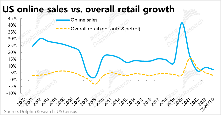 2、线上化 另一个清晰且验证可行的发展方向这是线上化。虽然近几年美国整体线上零售的增速开始向整体零售快速靠拢,但相比新千年以来平均已不超过5%的整体零售增速(剔除汽车和油气),线上零售近年来也至少有高个位数增速,仍有相对的高成长性。