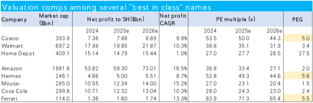 2、定量估值分析 首先从比较估值的角度,比较对象上我们一方面选取了商业模式接近、同属商超零售龙头的Walmart和Home Depot。另一方面,我们则不拘泥于行业赛道,选取了几家在各自行业内都属绝对龙头、竞争优势明显且业绩确定性极高的公司。 由下表可见,Costco在商超零售行业内的溢价明显。在未来两年利润增速预期大体相近的同时,Costco的PE估值比Walmart普遍要高出约40%。 即便跨行业来看,Costco相比我们选取的几家零售相关龙头,其估值也比大多数要高。可以看到仅有两家奢侈品龙头Hermes和Ferrari的估值水平和Costco大致相当,都在40x ~ 50x左右。 经业绩增速调整后的PEG指标,除Home Depot因利润CAGR过低导致PEG异常外,也仅有Costco、Hermes和Ferrari这三家的PEG也都“巧合”的高于5x。