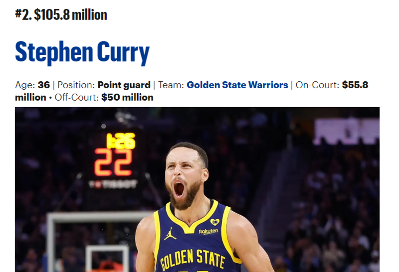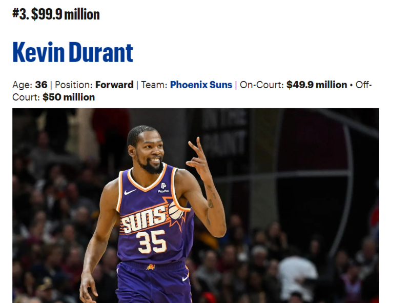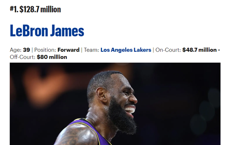北京时间10月22日,福布斯公布了2024年的NBA球员收入的前十排位,詹姆斯总收入1.287亿美元,连续第11年排在联盟之首。库里和杜兰特分列第二和第三,太阳三巨头均进入前十。具体排名和金额如下——![]() ![]() 1.詹姆斯(1.287亿)、2.库里(1.058亿)、3.杜兰特(9990万)、4.字母哥(9380万)、5.利拉德(6480万)、6.恩比德(6140万)、7.巴特勒(5880万)、8.布克(5820万)、9.东契奇(5800万)、10.比尔(5770万) 詹姆斯连续第11年成为NBA收入最高的球员,2024-25赛季的薪水为 4870 万美元,另外从代言、授权、纪念品和其他商业活动中获得约8000万美元。他的总收入(税前和经纪人费用前)为1.287亿美元,是福布斯进行NBA年收入排名15年历史上的最高收入,超过了詹姆斯2022-23赛季的1.245 亿美元。 ![]() 据福布斯估计,当詹姆斯在2014-15赛季6460万美元的总收入开始成为篮球界的收入之王时,NBA前10名收入最高的球员的总收入为3.68亿美元。今年的这10名球员的总收入是这个数字的两倍多,达到7.87亿美元,也打破了2022年7.51亿美元的纪录。 新的数字包括场外收入约 2.93 亿美元,除了詹姆斯,勇士队的库里(5000 万美元)、太阳队的杜兰特(5000 万美元)、雄鹿队的字母哥(4500 万美元)的场外收入也都挺高。 然而,NBA球员薪水飙升背后的真正原因却是在球场上。新劳资协议确保球员们总共能拿到篮球相关收入的 50% 左右,而 NBA 飙升的收入——上赛季约为 130 亿美元——继续让总经理们有更多钱可以花。詹姆斯成为 NBA 收入最高的球员的第一年,他的薪水为 2060 万美元;根据Spotrac的数据,本赛季82名球员的薪水将超过这一数字。 ![]() 库里成为2023-24赛季第一位薪水达到 5000 万美元的球员,本赛季工资帽已升至 1.406 亿美元,奢侈税门槛为 1.708 亿美元——比十年前增加了 122% 以上——费城 76 人队的恩比德、丹佛掘金队的约基奇和菲尼克斯太阳队的比尔现在也加入了5000万年薪的行列。 ![]() 与此同时,NBA在7月签署了新的全国媒体版权协议,据报道,11年总价值为 760 亿美元,是联盟收入的两倍半以上(按年均计算)。这将使未来几年的工资帽再提高10%——这是当前劳资协议允许的最大年度增幅。 因此,随着库里有望在2026-27赛季突破篮球界每年6000万美元的薪资上限,凯尔特人队的塔图姆将在2029-30赛季突破 7000万美元的薪资上限,NBA将很快迎来更多的薪资创纪录的日子。 |