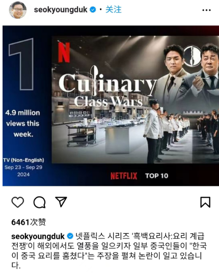 | 网飞前段时间推出的韩国料理真人秀综艺《黑白大厨:料理阶级大战》,连续多周闯进综艺类TOP10的榜单。 随着收视率的不断攀升,这档节目也因为韩餐文化的归属地问题引发热议。 ![]() 先是韩国官媒为“拔丝”的出生地究竟在中国还是韩国,特意出来站队。之后韩国网友又赞许网飞“识时务者为俊杰”,懂得把泡菜归为韩餐,“洗”去中国印记。 (示意图)更有不少韩国网友认为韩餐全球化这项大计划,已经初显成效,他们之前的努力也没有白费。一档真人秀,咋弄成这样了呢? 9月中旬上线的这档《黑白大厨:料理阶级大战》料理真人秀综艺,以科班出身和草根厨师之间的尖峰对决为主要看点。 ![]() 节目组特别邀请20名韩国知名星级大厨,以及80名民间高手参加厨艺比拼。 ![]() 评委则邀请被韩国称为美食家的白钟元,和韩国唯一米其林3星级主厨安成宰来蒙眼品评。 ![]() ![]() 因为节目的赛制设置为残酷的淘汰制,所以参赛厨师们为了成功晋级都拼命在镜头前展示自己的拿手技艺。 在第3集中,韩国首位女性中式料理主厨郑智善,就在制作“干萝卜叶黑醋炸肉段”时用上了一招绝活——拔丝。 ![]() 在当天的比赛中,郑智善把炒好的糖浆倒着淋在菜上。 ![]() 流下的糖浆经过自然风的降温,丝丝缕缕落下来,整个过程的视觉冲击力和成品看上去非常美观,看台上的韩国嘉宾也禁不住连连称赞。 节目播出后,不少中国网友指出,“拔丝”属于中餐鲁菜的传统技艺。郑智善在韩国综艺里作为必杀技来使用,出于礼貌应该介绍一下背景,这样显得她知识面广也容易得分。 (示意图)然而,中国网友们的讨论却遭到韩国媒体和专家的反对。 ![]() 韩国诚信女大教授徐敬德就批评中国网友在喷厨师前,先要看看自己有没有资格置喙。毕竟网飞在中国没有投放服务,看盗版还挑刺的态度让人火大。 ![]() 韩国多家知名媒体也撰文称,郑智善本身就曾经到中国留学,并且就读于扬州大学烹饪系。她毕业后还在中餐馆就职,系统地学习和实践过中餐技艺,所以会中餐并不稀奇。 ![]() 甚至还有媒体特意去采访了韩国国家遗产厅的负责人,对方表示韩餐这类非物质遗产要继续提高竞争力。为了应对歪曲韩国非物质遗产的情况,必要时将可能被“偷”的文化先发制人地申遗。 ![]() 不是,就说一句“拔丝”是中国鲁菜,韩媒和相关学者专家就要这么激动地声明表态吗? ![]() 还真就是这么在意。 “拔丝事件”发生没几天,韩国网友又在《黑白大厨》中发现了一个关键点。 原来,在《黑白大厨》后几期厨艺对决中,网飞将多次出现的泡菜翻译成了韩国叫法的“辛奇(Kimchi)”。这意味着,此前韩国专家徐敬德带领网友们出征讨伐网飞的努力没有白费。 ![]() 没错,此前我们讲过因为网飞在一档综艺中将“辛奇”翻译成泡菜,闹得韩国专家带队出征讨伐网飞的事件。(戳这里复习) ![]() 如今,网飞主动修正了“辛奇”的翻译。毕竟韩国市场有5500万潜在观众客户,网飞不想白白流失也是情有可原。 而这一次韩国官媒、专家大张旗鼓为“拔丝”的归属地辩论,也是因为《黑白大厨》这档网综,对于韩国政府的意义非同一般。 ![]() 韩国各界轮流下场为《黑白大厨》站队发声,也是因为今年刚好是韩国政府推广韩食全球化10周年之际的大日子。 早在2015年,韩国政府打出“韩食世界化”的口号,称希望用5年时间让韩国餐厅在海外的数量增加2倍 (示意图)为了完成这个政府级的国际文化推广项目,韩国政府号召农林畜产食品部等部门在纽约、巴黎等17个国家与地区进行美食周推广活动,向当地居民普及韩食具有时尚、健康、美味、环保的理念。 (示意图)除此之外,韩国还加强培养外籍韩餐厨师,并派遣韩国厨师出国留学、实习。 (示意图)2015年前,外国厨师想要在韩国学习烹饪和开店需要健康证等一系列负责手续。但为了韩食推广,政府出面为外籍厨师开绿灯,让他们带来自己国家的料理与韩料融合。 政府还派遣韩国厨师出国留学、实习。像是前面提到的做拔丝菜肴的郑智善厨师,在《黑白大厨》中还展示过一道松鼠鱼,也是在中国留学期间学会的。 《黑白大厨》中参赛的松鼠鱼另外对于曾经研发出具有广泛影响力的新式韩食,并且有韩裔血统的厨师,也要加大宣传。像是发明出“韩式墨西哥卷”的美籍韩裔厨师罗伊·崔,韩国媒体就会大力推广,加深韩食在海外的名气。 ![]() 罗伊·崔大力推行韩料朝国际进军之外,韩国政府除了申遗保护的泡菜,也将拉面、火鸡面这类食物植入进KPOP、韩国电影等文化产业中。 (示意图)据韩国权威数据统计,2015年至2023年期间,韩国拉面出口量每年突破新高,年出口量达到24.4万吨。这其中,少不了韩国明星和综艺的强势带货。 ![]() 比如韩国官媒曾报道过防弹少年团(BTS)成员智旻在直播中吃热腾腾的拉面,引发全球粉丝效仿的举动。此举直接让韩国某品牌拉面销量大增。 ![]() 为此,韩媒称赞其为拉面全球旋风主角,特别感谢他为韩食全球化做出的贡献。 ![]() 在这篇报道中还提到,韩国电影《寄生虫》中,特别加入了“牛排杂酱拌面”作为关键道具。电影获得多项奥斯卡后,这款韩食也很快被全球民众所熟知。足以见得,韩食与文化产业绑定的重要性。 (示意图)截止2024年,据韩国官方数据统计,在海外经营的韩食餐厅已经达到9900余家,米其林摘星的韩食餐厅也达到了21家。 韩国政府为此发布