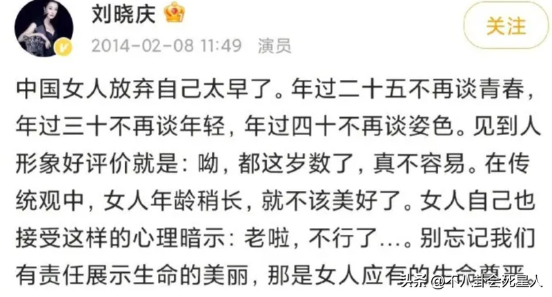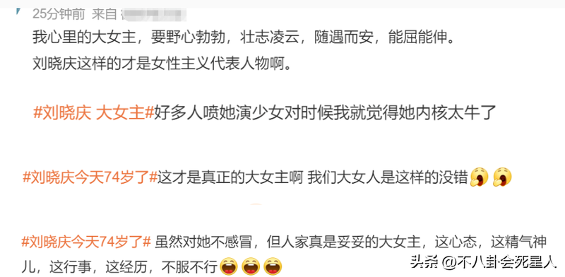 近日,因为网上传出刘晓庆的“感情瓜”,让这位年过70岁的女明星再次成为了“焦点”。![]() 但令人意想不到的是,刘晓庆多姿多彩的私生活反而收获了不少网友的“夸赞”。 ![]() 巧合的是,今天刚好是刘晓庆的74岁生日,别说是普通女性了,就算是年过70岁的女明星们几乎都处于低调退圈的状态,就算没有退圈的,私生活方面也十分低调。 ![]() 像刘晓庆这种74岁还因为“感情”上热搜的,可以说是女明星中的“第一人”。 ![]() 但正如前面说的,很多网友在关注刘晓庆大半生交往了很多位男性,结过4次婚,包括传闻她婚内出轨等等。 ![]() 但也有网友去翻看刘晓庆以往的很多发言,撇开感情方面来说,发现她的个人精神内核才是最让人佩服的地方。 ![]() 在她70岁的年纪接受采访时却说,美国人78岁还在竞选总统,法国人78岁还在谈恋爱,她正是年华。 ![]() 刘晓庆在14年的时候就发表言论,说中国女人不应该太早放弃自己,20岁就不谈青春,30岁后不谈年轻,但其实女人有责任展示生命的美丽,这是女性应有的生命尊严。 ![]() 被网友夸是“大女主”的刘晓庆,在谈到自己曾因为“偷税”犯错坐牢的经历时,她表示:只要人还活着,出来后还是一条好汉。事实上,她在接受惩罚后确实是积极面对自己的新生活,这个改错的心态还是很好的。 ![]() 在被问到和她曾经饰演过的“武则天”角色上有什么相似时,刘晓庆则说自己和武则天一样都能在逆境上求生存,但是不同的是,武则天“靠男人上位”,而她不需要。 ![]() ![]() 刘晓庆交往过不少男性,其中不乏富豪,但她表示自己几乎没花过男人的钱,反而是“搭钱”进去。 ![]() 但她自己却觉得,这样并没有什么不好的,她就喜欢这么做,她觉得自己要成为一个伟大的女人。 ![]() 而刘晓庆认为的“伟大的女人”就是水一样的女人,当她的男人站在高处,她就退去,让男人独立闪耀光芒,当他在低谷,她便涌来,温柔地拥抱他。 ![]() 刘晓庆在对待“两性关系”上是有自己的看法的,之前就有主持人问她,像她这种“强悍”的女性,男性和她在一起会不会觉得难受。 ![]() 刘晓庆却说不辛苦啊,其实她是一个很好的老婆,很会照顾人,所以每一位和她交往过的男人,其实都很怀念她。 ![]() 事实上,刘晓庆说的话不假,之前她和前夫上综艺的时候,前夫就对她深情告白,说刘晓庆是他生命里最重要的,唯一的,全身心爱过的女人。 ![]() 虽然刘晓庆结过4次婚,但她本人其实并不执着于婚姻,反而觉得一个人也挺好的,不结婚也可以拥有爱情。 ![]() 在谈到娱乐圈其他女明星的时候,刘晓庆更加体现出了“尊重女性”的思想。她觉得自己并不比其他女演员优越,因为她觉得娱乐圈的很多女演员都是很优秀的,包括那些早早退圈的。 ![]() 只是因为每个人的选择不一样,有人选择在娱乐圈奋斗,有人选择家庭,但并不代表谁的选择更优越。 ![]() 而作为娱乐圈的当红女星,刘晓庆也并没有觉得自己“高人一等”,她对自己的评价是,自己本来就一无所有,只不过是去名利场走了一圈,最后又回到原点。 ![]() 在谈到“男女平等”时,她的看法是,男人可以坐在一起喝酒谈论女性,女性也可以坐在一起喝茶讨论男性,这才是真正的男女平等。 ![]() 刘晓庆的社交平台上还写着:征服世界的不只是男人。 ![]() 看了刘晓庆曾经的很多言论,才知道,为什么这次的“感情瓜”反而让她收获了一波好评了。 |