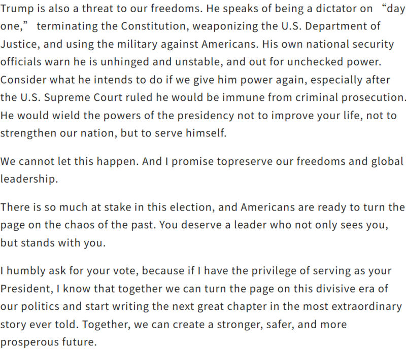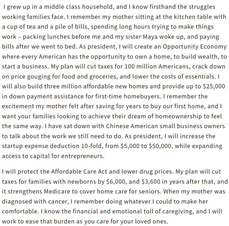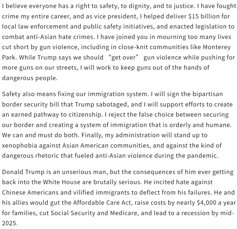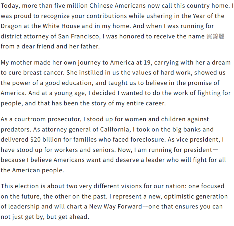 在大选还有最后三天的时候,民主党候选人哈里斯通过世报投书,向全美华人喊话,希望华人能为她投下宝贵一票。您认同她的说法,并会投票给她吗?![]() (以下为哈里斯背书原文翻译,并附英文原文) 世世代代,华裔在塑造和巩固美国的故事中发挥了至关重要的作用。19 世纪,华裔移民来到美国开采黄金,修建横贯大陆的铁路,帮助美国实现东西连接。从那时起,华裔美国人不仅在军队中贡献卓著,还为推进民权、推动科技创新、投身公共服务作出了重要贡献。 然而,华裔群体却一直面临排斥与不公。从19世纪末到20世纪初,针对华裔的排斥政策和法律限制了他们在住房、就业、教育方面的参与,许多唐人街被毁,居民也遭到暴力驱逐。排华法案的历史阴影依然提醒着我们那段充满歧视的过去。 如今,超过500万华裔美国人在这里扎根。我很自豪地与大家一起庆祝龙年的到来,也珍视华裔社区为美国做出的贡献。当年在旧金山竞选地方检察官时,我得到了华裔朋友的支持,并从他们那里得到了“賀錦麗”这个名字。 我母亲当年带着医治乳腺癌的梦想移民美国,教会了我努力工作的价值,展示了教育的力量,并让我坚信美国的承诺。年轻时,我便立志投身为民服务,这一信念贯穿了我的职业生涯。无论是作为法庭检察官、加州总检察长,还是副总统,我始终在为家庭、女性、儿童及弱势群体而战。而如今,我竞选总统,是因为我相信每位美国人都应拥有一个为他们而战的领导者。 我母亲在19岁时踏上了前往美国的旅程,怀着治愈乳腺癌的梦想。她向我们灌输了勤奋工作的价值观,展示了良好教育的力量,并教导我们要相信美国的承诺。在我年轻时,我决定要为人民而战,这一直是我职业生涯的主题。作为法庭检察官,我坚定地保护妇女儿童;担任加州总检察长时,我为面临丧失住房的家庭争取了200亿美元的补助;作为副总统,我为工薪家庭和老年人而战。而今天,我竞选总统,因为我相信美国需要并值得拥有一位致力于全体人民福祉的领导人。 这次选举关乎国家的两种截然不同的愿景:一种着眼于未来,另一种则停留在过去。我代表着新一代乐观向上的领导人,将规划出一条新的前进道路,为每位美国人提供公平的机会,不只是生存,而是繁荣。 我在一个中产阶级家庭长大,深知工薪家庭面临的困境。我记得母亲坐在厨房的餐桌前,端着一杯茶和一堆账单,花费很长时间努力使一切运转——在我和姐姐玛雅醒来之前打包午餐,在我们上床睡觉后支付账单。作为总统,我将创建一个“机会经济”,让每个美国人都有机会拥有住房、积累财富和创业。我的计划将为一亿美国人减税,打击食品和日用品的价格欺诈,降低生活必需品的成本。我还将建造三百万套负担得起的新住房,并为首次购房者提供高达25,000美元的首付补助。我记得母亲多年辛勤储蓄买下我们第一套住房时的兴奋心情,我希望你们的家庭也能感受到这样的喜悦。我曾与华裔小企业主会面,讨论我们仍需做的工作。作为总统,我将把初创费用的扣除从5,000美元提高到50,000美元,同时扩大企业家的融资渠道。 我将保护《平价医疗法案》,降低药品价格。我的计划将为有新生儿的家庭减税6,000美元,并在随后的几年里减税3,600美元,同时加强医疗保险,为老年人提供家庭护理。当我的母亲被诊断出癌症时,我记得我尽所能让她感到舒适。我了解护理工作所带来的经济和情感压力,我将努力减轻您在照顾亲人时的负担。 我相信每个人都有权享有安全、尊严和正义。我一生都在与犯罪作斗争,作为副总统,我帮助为地方执法和公共安全提供150亿美元,并通过立法打击反亚裔仇恨犯罪。我和你们一起哀悼因枪支暴力而逝去的太多生命,包括在蒙特雷公园等紧密团结的社区。特朗普称我们应该“克服”枪支暴力,同时推动街头更多的枪支流通,我将努力防止枪支落入危险分子手中。 安全也意味着修复我们的移民系统。我将签署川普破坏的两党边境安全法案,并支持创建合法的获得公民身份的途径。我拒绝在确保边境安全和建立有序的人道移民制度之间做出错误的选择。我们可以并且必须同时做到。最后,我的政府将反对针对亚裔美国人社区的仇外情绪,反对助长疫情期间反亚裔暴力的危险言论。 川普是一个不严肃的人,但他重返白宫的后果却非常严重。他煽动对华裔美国人的仇恨,诋毁移民,以转移自己的失败。他和他的盟友会削弱《平价医疗法案》,使家庭的年度开支增加近4,000美元,削减社会保障和医疗保险,并在2025年中期导致经济衰退。 川普也是对我们自由的威胁。他谈到要在“第一天”成为独裁者,终止宪法,武器化美国司法部,并将军队用来对付美国人。他自己国家安全的官员警告说,他情绪失控且不稳定,渴求不受限制的权力。想想如果我们再次赋予他权力,他打算做些什么,特别是在美国最高法院裁定他将免于刑事起诉之后。他行使总统权力的目的不是为了改善你的生活,不是为了增强我们的国家,而是为了服务于他自己。 我承诺将捍卫我们的自由和全球领导地位,坚守团结的信念,反对一切形式的分裂。这次选举至关重要,美国已经准备好翻过混乱的一页。你们需要一位理解你们、为你们而战的领导人。 因此,我谦卑地请求你们投我一票。让我有机会与大家共同书写美国下一章辉煌的故事,为一个更强大、更安全、更繁荣的未