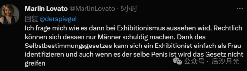 | 昨天,德国LGBT群体迎来了一次历史性胜利。 德国性别《自决法》(Selbstbestimmungsgesetz )在这一天正式生效,德国人将可以自由变性,不再有性别束缚。 这部法律是在今年4月,由社民党、绿党、自民党共同推动并获得通过的,于11月1日生效。 德国人的性别不再根据生理特征确定,由本人在内政部户籍登记处填写即可(一年还可更改一次) 除了性别之外,姓名(Vorname)也可以更改。比如奥拉夫.朔尔茨改为安娜.朔尔茨,王钢蛋改为王翠花,以确保姓名与性别匹配。 至于身份证件上的性别和姓名随意变更,会给警方查案或追逃带来多少麻烦?德国政府是不管的。总之,LGBT大过天。 《自决法》生效,确实给一些人带来了便利和好处。 ![]() 比如这位,德国极端环保NGO组织“最后一代”的骨干成员佩内洛普,TA自称心理女性,每次犯罪后(破坏交通、涂鸦博物馆名画等)都很痛苦,因为TA想被关入女子监狱,但法官总是不同意。 现在TA终于可以自定法律性别,跟女囚们关在一个屋子里了,而TA是有丁丁的。 德国已经走在世界最前列,绿党这些政客甭提多自豪了。法国不就是在奥运会开幕式上夹带了LGBT私货吗,跟德国的一步到位怎么比? 根据《自决法》,每一位成年德国人将有4种性别可以选择:男性、女性、不男不女、无性别。 它的突破性在于:人类的法律性别将不是由客观事实决定,而是由主观意志决定,还可以反悔。 它的问题在于:只有少数人得到了便利,而给绝大多数人带来了麻烦,特别是女性的性别空间将受到侵犯。 有人说,这不是反人类行为吗?可不能这么说。在德国你要敢这么说,轻则炸号,重则坐牢。 ![]() 这部法案的起草人是德国家庭事务部长丽萨·鲍斯(绿党)和德国司法部长马可·布施曼(自民党) 理由是:自主决定性别是实现人权的体现。 在儿童问题上,丽萨·鲍斯的方案是: 一、14岁-18岁的未成年人申请变更性别时,需经法定监护人同意。如果监护人不同意,则由法院裁决,以保护儿童利益优先为标准。 其实就是剥夺了父母拒绝更改未成年子女性别的权利。 二、14岁以下儿童,由法定监护人提交变更声明。 也就是说,只要父母是LGBT支持者,就可以改变子女的性别,而政府予以支持。 另外,德国还要求在中小学校园里开展LGBT教育。 丽萨·鲍斯等绿党政客搞出这项草案时,引发了许多人的抗议。 ![]() 选择党主席爱丽丝·魏德尔(Alice Weidel)公开炮轰绿党。 她说:联邦政府无视助长犯罪的警告,坚持提出该法,这不仅是罔顾科学事实,也违背了德国《基本法》。 魏德尔还表示:“孩子是我们最大的财富,家长的教育权利不容侵犯!” 但她的抗议又能怎样?现在法案还不是照样生效。 有趣的是,魏德尔是女同性恋,属于LGBT群体,但她从不用这个身份去吸收选票。 而丽萨·鲍斯,还有绿党外长贝尔伯克都是有两三个孩子的母亲,却在极力宣扬LGBT。 ![]() 更有趣的是,生了7个孩子的欧盟委员会主席冯德莱恩,更是在欧洲全力推广LGBT。哪个国家不配合,她就威胁制裁哪个国家,比如匈牙利和波兰。 既然支持LGBT是她们的价值观,那么她们自己为什么不去做女同?不去登记为男性性别?却要别人家的孩子变性? 德国网友也在骂这些人,由于偏左的德媒评论区总是在“吃掉”评论,大家只能在中右翼的媒体评论区发泄不满。 ![]() 一位德国网友说,“所以,不久以后就可以每年在登记处更改一次性别?!没有其他限制?!我相信德国的每个炼铜癖和强奸犯都会很开心,以后进入女性和女孩的更衣室就方便多了,一年一次。” ![]() “我想知道暴露狂会怎样。目前法律上只有男性会因此获罪,但有了《自决法》之后,暴露狂可以轻松将自己性别改为女性,即使暴露丁丁,也可以逃脱法律惩罚。” ![]() “能将此事提上日程,就不必惊讶为什么AfD(选择党)很快就会在选举中赢得绝对多数了。我认为我们的政客们只忙于处理一些琐事,对真正的问题却视而不见,没有人感兴趣。” …… 有些德国网友质问冯德莱恩、贝尔伯克这些人的母亲身份和责任。 对了,说到母亲,德国将来连“母亲”这个词都要禁止。 2023年4月,德国电视一台“每日新闻”在报道中有意避开了“妈妈”一词,引发轩然大波。 “每日新闻”在德国地位相当于《新闻联播》,当时它在报道休产假的问题。 然而,它的话术是“生孩子的人的伴侣,可以在孩子出生两周后获得假期。” 全文避开”母亲或妈妈“,只用“生孩子的人”来代替。 德国人质问:“母亲”这个词为何说不得,难道它是脏话吗? 在一浪高于一浪的批评声中,德国电视一台发言人澄清说,从来没有收到过相关的政府指令。 然后它们将文字版中的“生孩子的人”改成了“妈妈”。 ![]() 这只是绿党这帮人废除“妈妈”概念的试水行为,先看看社会的反应。毕竟,“母亲”这个伟大的认知,一时半会还很难被颠覆。 不过,它们的“性别自由”已经实现,《自决法》生效将意味着: 一、女厕所,女更衣室,女浴室等女性空间,将被自称“心理女性”的生理男性合法闯入。 二、如果女性因此尖叫、驱赶入侵者,令“法律女性”感到难堪。那么,“法律女性”可以对其进行举报,被举报者将面临最高10000欧元罚款。 三、德国公民每年都有一次机会更改自己的性别,提前三个月在内政部申请即可。 “法律女性”,不仅无需割掉丁丁,也无需雌激素,一切由个人作主。 表面上看这部法律是平等的,因为女性也可以登记为“