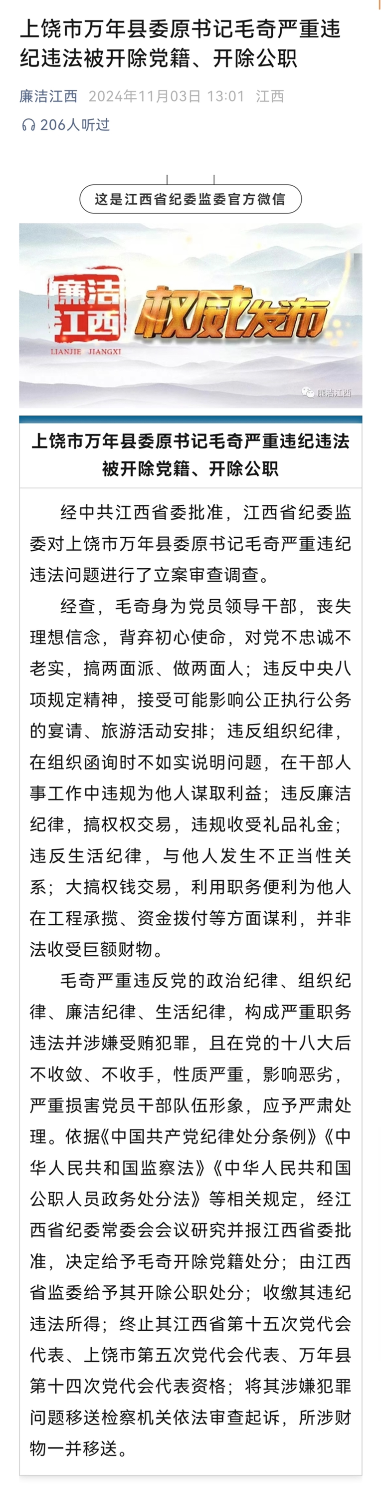 ![]() 周末了,简单说两句。 今天的两份通报,让两件关注度很高的事迎来了后续。 一份关于姜萍。 ![]() 一份关于毛奇。 ![]() 这两份通报,都上了热搜,而且姜萍的相关话题更多,更有讨论度。 但我其实不关心姜萍,我更关心毛奇。 从头到尾,关于姜萍我一篇文章都没写,只在另外一个话题的文章里提了一嘴。 但关于毛奇,我写了三篇: 堂堂乡党委书记,居然都需要网络举报了 县委书记性侵案,反转了? 李佩霞的事,闹大了 我知道,写姜萍更安全,更有流量,但我就是无法说服自己去写。 从一开始,姜萍是天才少女,还是欺世盗名,我都不在乎。 在我看来,姜萍的事,是她自己、周围一小部分人和参赛者的事,非关大众利益。 按当时的报道,人们对如此传奇的事情投入关注,发出惊叹,能理解,但搞得声势如此之大,远远超出我的意料。 维护者,竭力将十几岁的少女捧上神坛;质疑者,恨不得立刻扒下她的画皮。 如今真相大白,欢呼者有之,打脸者有之。 这一切,都让我不解。 我不明白,人们为什么会对一个少女在一个大部分人根本看不懂的比赛里的表现,投入如此不成比例的关注?形成如此割裂的分歧?浪费如此海量的口水? 我不喜欢参与造神,更不喜欢参与毁神,所以真相大白之后,我没觉得反转,也没觉得被愚弄。 无论是之前,还是现在,我对姜萍事件的态度都没有变化,她是天才也好,骗子也好,对我来说都没啥区别。 相比之下,我更关心毛奇和毛奇们的所作所为。 毛奇是一个县的县委书记,他的违纪违法,往小了说,影响一个县及其几十万公民的民生大计;往大了说,是地方官场生态乃至整个官场生态的一部分。 这样的事,理应得到足够的重视、讨论和监督。 但很遗憾,相比于对姜萍的讨论和分析,网友和作者对毛奇的兴趣似乎并没有那么大,那么久。 就比如,吾未见恨毛奇如恨姜萍者,也未见有那么多人对毛奇旷日持久地抓着不放的。 这是更大的遗憾。 也许是觉得讨论毛奇不安全,也许是对严肃的时政话题避之唯恐不及,最后的结果就是讨论姜萍的人多,讨论毛奇的人少。 哪怕讨论姜萍的门槛,远远高过讨论毛奇。 可作为一个公共说理者,当姜萍和毛奇同时成为话题时,我肯定选择讨论毛奇,而非姜萍。 不是说姜萍不值得讨论,而是在我们的注意力如此稀缺的当下,我愿意当一个有“公心”的人,把有限的资源用在公共领域,而不是盯着一个人的私德,要求他尽善尽美。 这可能不是大部分人的共识,但却是我对自己的要求。 背景报道: 主动投案3个多月后毛奇被“双开”,通报未提权色交易 江西省纪委监委官方微信“廉洁江西”11月3日消息,上饶市万年县委原书记毛奇严重违纪违法被开除党籍、开除公职。经查,毛奇身为党员领导干部,丧失理想信念,背弃初心使命,对党不忠诚不老实,搞两面派、做两面人;违反中央八项规定精神,接受可能影响公正执行公务的宴请、旅游活动安排;违反组织纪律,在组织函询时不如实说明问题,在干部人事工作中违规为他人谋取利益;违反廉洁纪律,搞权权交易,违规收受礼品礼金;违反生活纪律,与他人发生不正当性关系;大搞权钱交易,利用职务便利为他人在工程承揽、资金拨付等方面谋利,并非法收受巨额财物。除外界关注的被实名举报涉嫌性侵女下属外,通报并未提及权色交易。不过,通报指出毛奇搞权权交易。在以往纪检监察部门的通报中,权钱交易、权色交易比较常见,权权交易倒是不大提及。《中国共产党纪律处分条例》规定,权权交易是指党员干部相互利用职权或者职务上的影响为对方及其配偶、子女及其配偶等亲属、身边工作人员和其他特定关系人谋取利益的违纪行为。权权交易重在强调进行了交易,而且是权力的交易,实际上是一种利益交换。同时《条例》还明确,搞权权交易的,给予警告或者严重警告处分;情节较重的,给予撤销党内职务或者留党察看处分;情节严重的,给予开除党籍处分。 在毛奇之前,也有多人被批搞权权交易。今年5月21日,中央纪委国家监委网站发布消息,日前,经广东省委批准,广东省纪委监委对广东省代建项目管理局原党组书记、局长杜挺严重违纪违法问题进行了立案审查调查。在通报中,杜挺也被批大搞权权交易。去年2月“落马”的九江市濂溪区政协原主席彭青松在通报中也被批搞权权交易。 ![]() 公开资料显示,毛奇,1982年3月出生,江西上饶人,大学文化,2000年12月加入中国共产党,2003年12月参加工作。毛奇曾任婺源县委常委、常务副县长,共青团上饶市委书记、党组书记,万年县委副书记,县长、党组书记等职务,2021年7月任万年县委书记。 今年7月25日,毛奇被网络实名举报。实名举报人李长柳通过网络举报称,自己的女儿李佩霞是万年县上坊乡原党委书记。“万年县委书记毛某,曾长期利用职权对她进行精神控制,并强制猥亵、性侵。今年5月23日,李佩霞表示要去省里举报毛某,3天后自己却被万年县纪委监委带走并留置至今,无法对外发声。” 当天晚上,上饶市委联合调查组发布通报,关注到网上有关举报万年县委领导毛某信息后,市委高度重视,立即成立联合调查组进行调查核实,调查情况将及时向社会公布。江西省纪委省监委网站7月26日通报,万年县委书记毛奇涉嫌严重违纪违法,主动向组织交代问题,目前正接受江西省纪委省监委纪律审查和监察调查。 6月17日,上饶市纪委监委官方微信公众号曾发布李佩霞被查的