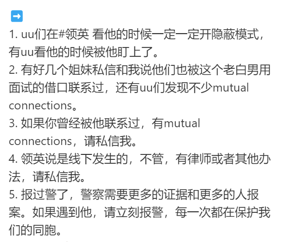 “老白男假借面试,诱骗中国女生入局,献给大佬”最近,小红书博主@勇敢者 发帖分享诡异的求职面试经历,在留学圈传疯了,对方步步诱拐不怀好意,她快被吓得魂都没了。我们也联系上博主@勇敢者 听她讲述那段噩梦般的求职惊魂。![]() 图片来自小红书博主@勇敢者,已获授权使用 版权属原作者 @勇敢者英文名叫Kiki,是今年毕业的中国留学生,跟许多人一样,她会从社媒上留意各种工作机会。 不久前,她收到Linkedin上一个陌生的白人老头私信,说她的技能跟他公司需要的人才要求很匹配,希望能进一步聊聊。 为了甄别老头的身份,Kiki查看了老白男的linkedin,发现有一些行业的牛人给他背书,随后又查看了他公司的网页,制作精良,不太像粗制滥造的山寨网站的样子。 私信上聊了几句后,对方要求Kiki把简历发给他,看出对方也要招人意向,一切都显示很正常,她答应了去在老白男的公司面试。 ![]() 图片来自小红书博主@勇敢者,已获授权使用 版权属原作者 老白男的公司是在一家写字楼,看着还算正规。公司规模不大,办公室还有别的公司一起合租。 面试,从简单的自我介绍开始,最初,老白男还把Kiki和另外一个中国女生的名字混淆了,这时,Kiki无意中瞥见老白男手机的联系人信息,她很震惊地发现,几乎都是中国女生的名字,让她觉得很可疑。 接下来面试的话题,越来越偏离了正常的轨迹。 Kiki介绍完自己的情况后,老白男开启small talk模式。 他自称哈佛毕业,认识许多牛人校友,有人脉; 还给Kiki看他的Instagram,都是跟各种大人物的合照:政客、企业家,某共和党前州长...炫耀有资源; 还吹嘘自己公司跟美国ZF的一些机构有合作,生活富足不差钱 ![]() 图片来自小红书博主@勇敢者,已获授权使用 版权属原作者 说了大半个小时的废话,都只是为了凸显精英人设。 接下来话题一转,说到他个人生活背景,已婚有女儿,还给Kiki看他手机上孙女照片的屏保,各种与家人的合照,试图营造一个慈祥老爷爷的形象。 可疑信号一个接一个。 工作和专业,基本一句没提,老白男开始打听起Kiki的个人信息。 Kiki 回忆道,“他问我平时喜欢去哪里买衣服,在美国有什么朋友”等等。 期间,老白男还会对她的外表作出评价,说她还是一个小孩,夸她可爱、漂亮。 终于,老白男抛出诱饵,他说如果去他和大佬的”酒局“,承诺帮忙就业,还说这周要去见两个大人物,问她要不要一起去吃饭,还问她希望什么样的回报。 Kiki感觉到越来越不对劲,反问老白男,看中她的什么技能,为什么愿意抛出橄榄枝。 估计是从来没人问过这样的问题,老白男下意识地说,他其实群发了很多私信,但只有Kiki一个人回复。 ![]() 说到这里,Kiki明白这就是一个局,老白男一步步从浅到深诱拐,还做服从性测试。 当时她心里慌极了,虽然表面上强行伪装着镇定,但实际上大脑几乎夯机,因为太害怕反应不过来。 Kiki说,在整个诡异面试过程中,老白男都在有意识地创造肢体接触,临走的时候,还强行hug,这让她觉得很不舒服。 Kiki尝试过把这件事反馈给Linkedin,但对方说,老白男线上的资料没问题,线下的活动他们管不着,最后不了了之。 曾经报过警,但因为只是个案,警察需要更多的人证和证据。 但Kiki推测,根据老白男手机里许多中国女生的联系方式,估计他应该不是第一次出来寻找猎物,而且很可能还曾经得手过。 回家后,KIKi就把这次求职惊魂写下来,希望提醒姐妹们注意避雷。 没想到帖子发布后传疯了,也有一些女生给Kiki发私信,说曾经遭受过这老男人的骚扰。 Kiki呼吁大家能帮忙扩散这个信息,能警告一个是一个,她希望在她之后,不要有别的受害者了。 ![]() 图片来自小红书博主@勇敢者,已获授权使用 版权属原作者 |