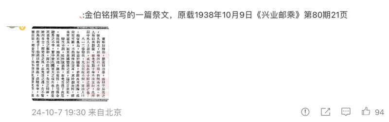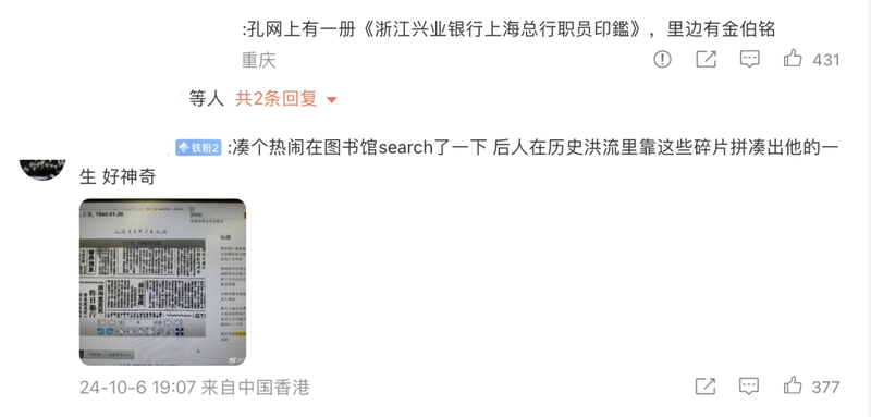 | 一支穿云箭,千军万马来相见。 10月6日,詹青云在微博上分享了一个非常有意思的寻人故事。 几乎是一夜之间,全网都在寻找金伯铭。 ● 詹青云微博寻人者名叫埃迪(Eddie Mears),詹青云的律师同事,一位非典型美国人。 与惯常的寻人不同,他要寻找的金伯铭与他无任何交集,且早已故去。 茫茫人海寻一陌生人,何其不易,埃迪原本并没有信心。 但令他欣喜的是,两年多的抽丝剥茧,他获取的线索越来越多,如今更是惊动了中国的媒体。 中国人搜索的DNA一旦动了,力量是很可怕的。 ![]() ![]() ● 詹青云微博下的网友评论多方的合力之下,金伯铭不仅被寻到,他的人生也被勾勒得越来越清晰。 究竟是怎么样的魔力,能令中国网友如此着迷? 故事,还得从一张老照片说起。 ![]() 两年前,埃迪和父亲回到密歇根的老家,清点奶奶的遗物。 老人家早已在1992年去世,那时的埃迪才6岁,对于奶奶的样貌,他没有太深的印象。 但通过家人的讲述,埃迪知道,奶奶定是那个时代的传奇女子。 奶奶有个很动听的名字——维罗妮卡·埃斯特尔·米尔斯(Veronica Estelle Mears)。19世纪中期,她的家族从波兰移民到美国。 ● 埃迪的奶奶维罗妮卡·埃斯特尔·米尔斯上世纪30年代,美国女性能接受高等教育的很少,何况,奶奶来自一个并不富裕的移民家庭。 但这样一个平民女子却克服了重重障碍,进入密歇根大学深造。 听闻,她还进行过一次疯狂的单身冒险旅行。 在大学里,奶奶不被性别歧视所束缚,她积极加入了一个关心国际学生事务的“世界政治委员会”。 组织的会长叫Benjamin King(本杰明·金),这个名字,奶奶珍藏了一辈子。 落灰的保险柜里,完好地保存了一张老照片,埃迪仔细端摩着。 ● 埃迪奶奶(最右)和金伯铭一起出席1933年5月在密歇根大学举行的告别派对照片拍摄于1933年,背景是密歇根大学的安娜堡校区,彼时的奶奶才20岁,风华正茂。 紧挨着她的,是一位拥有着亚裔面孔的年轻男子。 乍看这只是一张普通的合照,然而照片上手写的一行字让它变得意义非凡,“To Veronica with love”,落款是“Benjamin”。 在照片的背后,奶奶亦工整地备注了其他3个人的名字,其中就有Benjamin King。 很显然,这张照片是本杰明送给奶奶的,而照片上那唯一的男性就是他。 那个时代的“with love”不同于现在,普通朋友间是绝少使用的,他是奶奶的挚友还是恋人?抑或深情的追求者? 那时候美国大学里的亚裔面孔很少,且美国学生不太与他们交往,奶奶怎么会和他成为朋友呢? 他究竟是谁,又拥有着怎样的魅力,才能让奶奶这般潇洒的女子如此惦念? 埃迪很好奇,太好奇了。 他决定走进照片的背后,去会一会这个神秘的人。 ![]() Benjamin King,一个很常见的美国人名,它离确定的中国名字“金伯铭”之间,隔了条信息的鸿沟。 借着律师的搜商,埃迪先到密歇根大学的学生报纸——《密歇根日报》的公共档案数据库中,搜出了约20篇有关“Benjamin King”的文章,这些多半是本杰明参加各种聚会或者发言的小型报道,其中的关键几篇,是关于中日关系的演讲。 原来他是校园里的风云人物啊,埃迪心想。 此时恰逢“九·一八”事变期间,从本杰明鲜明的立场推测,他很可能是中国人。 既如此,Benjamin King一定不是他的本名。 埃迪遂联系到本特利历史图书馆,这里积累了大量有关密歇根州和密歇根大学的资料,借着工作人员的帮助,他终于找到了本杰明的学生档案。 神秘的面纱被揭开了一角:Gin Bo Min,毕业于沪江大学,家住杭州马市街11号。 ● 金伯铭在密歇根大学的学生记录这是用威妥玛式拼音标注的中文名,此读音对应的汉字排列组合非常之多,中国人对此都倍感头大,更何况是识不了几个汉字的美国人。 为此,埃迪开始苦学中文。 功夫不负有心人,自身的努力加上詹青云和其他几位中国朋友的帮助,他终于用“金伯铭”三个字的组合,搜出了与他所了解的信息相符的资料。 与此同时,他找到了一份1949年上海扶轮社(国际人道组织)的成员名单,上面包含了金伯铭的名字、在沪地址,和一张他在上海的照片。 埃迪超惊喜:“就是他!那个照片中的男人!” ● 金伯铭赴美留学时的报道一个确切的名字,能打开新世界的大门。 那个时代的知识分子非常稀缺,留洋海外的更是屈指可数,所以金伯铭的信息相对易查。 拿到密歇根大学的硕士学位后,金伯铭并未留念海外优越的生活,而是选择速速归国。 他先后在北京大学和沪江大学执教,如今扫描沪江大学旧图书馆楼前铭牌上的二维码,还会发现里面还记载了当年图书馆建成投入使用之时,金伯铭将家中祖辈传下的一批珍稀古籍捐赠给校方的事迹(注:沪江大学现已并入上海理工大学,但部分老楼依旧存在,包括昔日的图书馆)。 ● 金伯铭曾参与沪江大学图书馆募捐运动1935年7月,金伯铭离开大学校园,入职到位于上海的浙江地方银行任襄理(经理助理),四年后的1939年,他又跳槽到上海浙江兴业银行总部。 那个时候的银行薪水跟现在一样,与入职年限、业绩等挂钩,从5元到500元不等,刚入职的金伯铭,月薪在四五十元左右,可见能力不低。 ● 金伯铭工作过的银行发行的纸币果然,刚入职不久的金伯铭就通过商务印书馆出版了一本《银行实践》,里面书写了他对于现代银行的思考,在银行业初兴,相关理论尚未系统化的时期,这样一本融合了西方视角的书籍具有相当的参考价值。 ● 《银行实践》神的是,詹青云竟然从一家