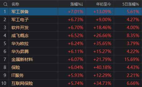 | 11月5日,市场全天低开高走,创业板指领涨,北证50指数涨超7%。截至收盘,沪指涨2.32%,深成指涨3.22%,创业板指涨4.75%。 板块方面,军工、软件、互联网金融、半导体等板块涨幅居前,无下跌板块。 整体上个股涨多跌少,全市场超5000只个股上涨。沪深两市全天成交额2.3万亿,较上个交易日放量6097亿。 你又闻到牛市的香气了吗?今天,A股传来多个积极信号。一是,各大指数纷纷朝收复10月8日阴线再进一大步,有较明显的向上突破迹象。以万得全A平均股价为例,最新收盘价(20.20元)只需再上涨不到5%,即可反包10月8日的最高点(21.17元)。 ![]() 二是,今天全A有超5000只个股收涨,为10月18日以来,时隔11个交易日后首次。 ![]() Wind数据进一步显示,目前已有近4000只个股,在10月8日~11月5日这个区间累计上涨,再次说明“全面反包”近在咫尺。 ![]() 三是,截至收盘全A成交额为2.35万亿元,已连续25个交易日突破1万亿元,超过2023年4月3日—5月10日的连续24个交易日,创2015年7月中旬以来,A股新的连续万亿成交额纪录。4个字总结当下A股趋势,可以说“量价齐升”仍在持续。而众所周知,本周是个“超级事件周”。 据新华社报道,十四届全国人大常委会第十二次会议昨日上午在北京人民大会堂举行第一次全体会议。会议审议了国务院关于提请审议增加地方政府债务限额置换存量隐性债务的议案。北京时间明天(周三),美国2024年总统大选结果即将揭晓。 据央视新闻,美国东部时间11月5日零时刚过,新罕布什尔州小镇迪克斯维尔山口的选民率先开始投票,这标志着第60届美国总统选举投票正式开始。到了周五,美联储是否降息以及降息幅度也即将公布。 不知这两天市场的强势表现,能否向大家传递更多信心?三大板块同日大涨同花顺数据显示,今天市场全线走强,无板块下跌。 ![]() 而结合时间轴及涨幅来看,有三大板块的表现值得细品。分别是: 1)军工 军工装备、军工电子两个板块,今天涨幅在全市场居首。 据央视报道,今天(11月5日)上午,空军在京组织新闻发布会,介绍庆祝人民空军成立75周年,以及参加第十五届中国航展有关信息,空军装备部牛文博上校介绍,第十五届中国航展期间,中型隐身多用途战斗机歼-35A,将有机会与大家见面。军事专家李莉解读称,这意味着我国空军将同时拥有两款隐形战斗机,即歼-20和歼-35A。 继美国空军装备F-22和F-35后,中国成为全球第二个同时装备两款隐身战机的国家。方正证券表示,军工板块由于行业需求节奏不断推迟导致基本面短期持续承压,目前来看板块库存已逐渐见底,行业将伴随后续订单下达开启新一轮库存周期,全产业链复苏在即。2024年三季报表现符合市场预期,后续节奏上看订单下达仍为关注重点,近期多家军工上市公司披露订单合同公告,表明行业复苏或已开始,当下需把握军工左侧布局机遇。 2)半导体 据华福证券统计,2024年前三季度,半导体行业相关上市公司的营业总收入为3776.91亿元,同比增长22.84%;归母净利润为257.31亿元,同比增长42.58%。三季度单季营业收入为1371.48亿元,同比增长20.88%,环比增长6.09%;归母净利润为97.38亿元,同比增长46.73%。业内人士表示,半导体行业在近两年的下行周期里完成了较为充分的去库存和供给侧出清,如今在AI算力需求的边际拉动下,在新一轮终端AI化的创新预期中,行业有望迎来持续性较强的上行周期。中国银河证券指出,短期科技板块仍是资金交易主线,对后市科技板块的持续反弹呈乐观态度。 3)金融 非银金融概念早间就全线走强,互联金融方向领涨,板块指数高开高走;券商股也大幅拉升。可以说,当“牛市”共识和情绪得到强化时,金融板块就会备受资金关注。据报道,沪深交易所早间公布的最新两融数据显示,截至昨日,融资融券余额为17037.89亿元,较前一交易日增加154.01亿元。 其中非银金融获融资净买入41.81亿元,位居申万一级行业第一。从个股买卖金额来看,东方财富获融资净买入16.26亿元,位居个股第一。今天,东方财富再次以552.7亿元的成交额,居全市场榜首,同时大涨10.37%。 ![]() 另外,刚刚结束的三季报统计显示,多数上市券商在三季度业绩出现反转趋势。第一创业、东北证券三季度单季净利润增速均超10倍,湘财股份、哈投股份、国盛金控等券商单季业绩也实现翻倍。 机构指出,随着一揽子增量政策落地实施,四季度经济有望延续向上趋势。非银金融行业,其盈利增速居前,当前其市净率估值处于历史中等水平,未来业绩和估值均仍有较大上升空间。人民日报刊文: 全面客观冷静看待当前经济形势今天早盘小幅低开之后,A股与港股均持续走高,人民币随后亦明显走强。 ![]() 据券商中国,有分析认为,近期中国资产之所以强势,可能还是与经济的回暖信号有关。今天早间公布的10月财新中国通用服务业经营活动指数(服务业PMI)录得52.0,高于9月1.7个百分点,为近三个月高点,显示服务业景气度回升。 人民日报今天也刊发题为《全面客观冷静看待当前经济形势》的文章称:随着存量政策和一揽子增量政策持续发力显效,发展的活力和动力将进一步释放,为四季度经济持续回升向好提供足够支撑。 有充足的理由相信,我国经济企稳回升的态势将进一步巩固。当前也有一些错读误读的声音,有的甚至已经脱离了经济运行本身。必须第一时间展开辨析、批驳和斗争,绝不能让错误言论损害我国经济回升向好的态势。 展望2025年,浙商