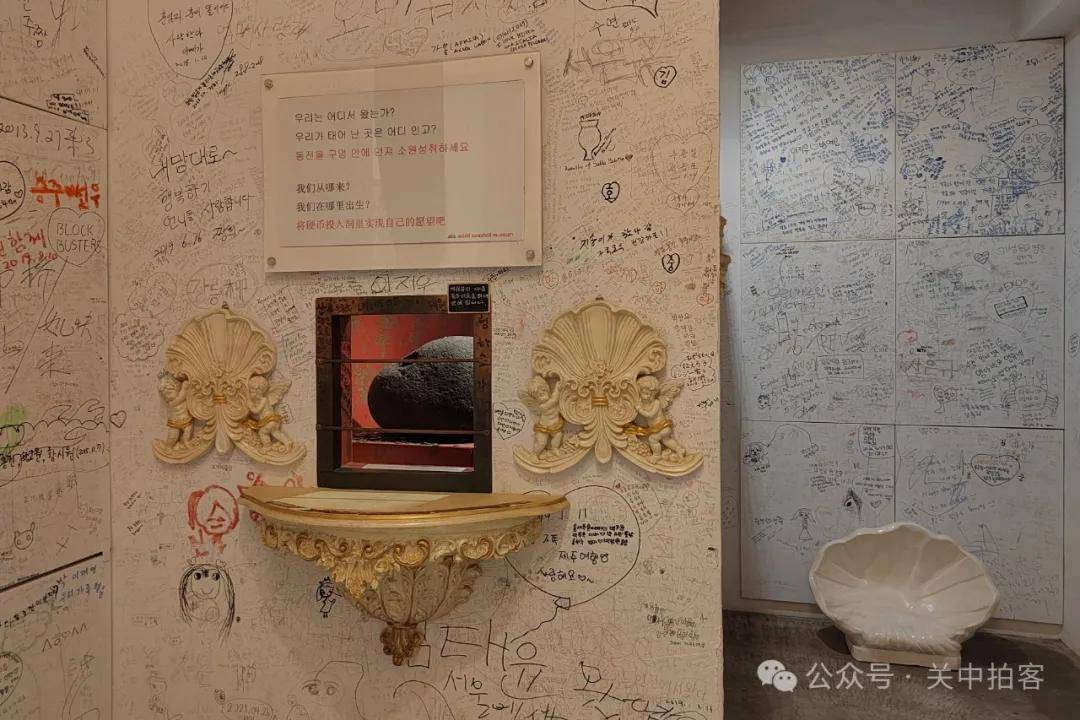 在一层展厅的角落里,有一个神秘的小窗口,上面写着:“我们从哪来?我们在哪里出生?将硬币投入洞里实现自己的愿望吧?”我靠近窗口,向里面看去,摆放着一块黑色的石头和白色的珊瑚。第一眼,没看明白,这是什么意思?当我看懂以后,感觉好低俗呀! 1983年夏天,这块石头被发现于济州岛的海边,被称为“阴石”。它是火山爆发天然形成的艺术品,也是一位有福气的“女人”,能够给观赏者带来幸运吉祥。
