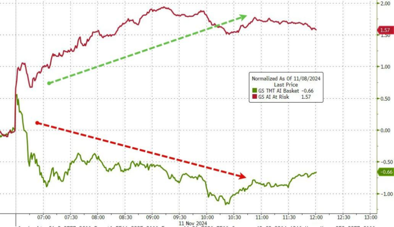 | “特朗普交易”持续,美股三大指数续刷盘中新高,标普史上首次收于6000点关口上方,道指收涨304点,首次收于44000点上方,受科技股和芯片股拖累,纳指盘中一度转跌,但仍勉强收涨并创新高。罗素小盘股收涨1.47%继续领跑,上周累涨8.57%。银行股、加密货币概念股普涨,而大宗商品承压拖累矿业股、金银股普跌,芯片股、科技股也走软: 美股三大指数齐涨。标普500指数收涨5.81点,涨幅0.10%,报6001.35点。与经济周期密切相关的道指收涨304.14点,涨幅0.69%,报44293.13点。科技股居多的纳指收涨11.99点,涨幅0.06%,报19298.76点。纳指100指数收跌0.05%。衡量纳指100科技业成份股表现的纳斯达克科技市值加权指数(NDXTMC)收跌0.79%。对经济周期更敏感的罗素2000小盘股指数收涨1.47%。恐慌指数VIX收涨0.20%,报14.97。 ![]() 小盘股领涨,纳指涨幅靠后 美股行业ETF收盘涨跌互现。区域银行ETF涨超3%,银行业ETF涨近3%,全球航空业ETF与可选消费ETF各涨超2%,网络股指数涨近2%,金融业ETF涨近1.5%。 而半导体ETF跌逾2%,全球科技股ETF、生物科技指数ETF、医疗业ETF及科技行业ETF至少跌0.5%。 标普500指数的11个板块涨跌不一。可选消费板块收涨1.76%,金融板块收涨1.42%,工业板块收涨0.80%,电信板块收涨0.45%,能源板块收涨0.42%,公用事业板块收涨0.30%,原材料板块收跌0.51%,必选消费板块收跌0.53%,医疗保健板块收跌0.59%,房地产板块收跌0.80%,科技板块收跌0.89%。 投研策略上:知名分析师Ed Yardeni预计标普500指数到2030年将达到1万点,意味着未来五年内该指数将上涨66.6%。这一预测基于市场对特朗普上台后将实施的放松监管和减税措施的乐观预期。摩根大通的Jacob Manoukian也指出,监管压力将下降,市场对选举结果反应积极,特别是小盘股和地区性银行,反映了人们对美国经济弹性和增长前景的乐观态度。高盛交易员预计,随着美国大选带动的交易行情结束,美股市场将进入轮动行情,投资者将转向市值较小的公司和周期性/通胀主题的投资机会。 “科技七姐妹”多数下跌。特斯拉收涨8.96%,上周累涨29.01%,11月4日收盘以来累涨超过44.25%。谷歌A收涨1.12%,亚马逊则收跌0.64%,Meta Platforms收跌1%,微软收跌1.07%,苹果收跌1.02%,英伟达收跌1.61%。 ![]() 特斯拉11月4日收盘以来累涨超过44.25% 芯片股集体下跌。费城半导体指数收跌2.54%。行业ETF SOXX收跌2.5%。英伟达两倍做多ETF收跌3.14%。阿斯麦ADR收涨0.27%,而AMD收跌0.41%,博通收跌2.58%。Arm控股收跌3.74%。美光科技收跌2.9%,英特尔收跌4.39%。台积电ADR收跌3.55%,高通收跌1.53%,安森美半导体收跌0.64%,科磊收跌3.11%,Wolfspeed收跌9.67%。 AI概念股涨多跌少。超微电脑收跌5.26%,甲骨文收跌0.06%,CrowdStrike收涨3.75%,Snowflake收涨2.16%,Serve Robotics收涨3.43%,戴尔科技收涨3.19%,英伟达持股的AI语音公司SoundHound AI收涨7.92%,BigBear.ai收涨11.36%,Palantir收涨3.17%,BullFrog AI收涨0.76,C3.ai收涨2.29%。 中概指数小幅收涨。纳斯达克金龙中国指数收涨0.59%。ETF中,富时中国3倍做多ETF(YINN)收跌0.72%,中概互联网指数ETF(KWEB)收涨0.34%,中国科技指数ETF(CQQQ)收涨2.6%。富时A50期指连续夜盘收跌0.28%,报13677.000点。 热门中概股中,极氪收涨14.22%,小鹏汽车收涨5.59%,老虎证券收涨5.23%,理想汽车收涨2.88%,携程网收涨1.83%,京东收涨1.75%,阿里巴巴收涨1.31%,网易收涨1.11%,蒙牛乳业(ADR)收涨0.91%,B站收涨0.71%,唯品会持平,大全新能源收跌0.41%,新东方收跌0.51%,拼多多收跌0.56%,蔚来收跌0.59%,百度收跌0.76%,美团ADR收跌0.94%,腾讯控股ADR收跌1.26%,名创优品收跌1.45%,房多多收跌17.56%。 比特币涨幅扩大至超11%,加密货币概念股大涨。Mercurity Fintech ADR收涨81.4%,嘉楠科技ADR收涨41.27%,“比特币持仓大户”微策投资MSTR收涨25.73%创历史新高,公告宣布公司耗资大约20.3亿美元买入大约2.72万枚比特币,创将近四年来最大买入,此前10月30日公司曾宣布要再融420亿美元,继续买比特币。BTC Digital收涨37.7%,MARA Holdings收涨29.92%,加密货币交易所巨头Coinbase收涨19.76%。加密货币“妖股”优点互动股价盘中涨100%后收跌20%。 铁矿石跌近100美元关口,矿业股普跌。必和必拓收跌3.01%,力拓收跌2.84%,淡水河谷收跌3.49%,瑞银将该公司评级从“买入”下调至“中性”,目标价从14美元下调至11.50美元。 银行股普涨。费城证交所KBW银行指数收涨2.35%。道琼斯KBW地区银行指数收涨3.27%。富国银行收涨3.6%,高盛收涨2.22%,摩根士丹利收涨3.08%,美国银行收涨2.11%。 ![]() 金融板块普涨 全球第一大黄金ETF上周遭遇逾两年最大单周资金赎回,金银矿业股普跌。彭博汇编数据显示,黄金ETF SPDR Gold Shares(GLD)上周发生超过10亿美元资金外流,创2022年7月份以来最大。哈莫尼黄金收跌9.39%,金田公司收跌8.42%。 其他重点个股:(1)特朗普媒体科技(DJT)盘初涨近7.8%后收涨4.70%,前一交易日收涨15.22%。(2)诺瓦瓦克斯医药盘初涨超16.6%后收涨1.12%,此前美国FDA解除了该公司新冠肺炎-流感联合疫苗和独立流感疫苗候选药品的临床暂停。(3)Monolithic Power跌近25%后收跌14.97%,Edgewater Research指出美国芯源的产品有问题,可能会失去给英伟达Blackwell显卡供应零件的机会,但Rosenblatt分析师Mosesmann否认了这一消息。(4)诺和诺德美股收涨1.76%,欧股收涨3.78%,摩根大通将其列入“正面催化清单”。(5)百时美施贵宝(BMY)收涨10.49%,最新临床和现实世界数据表明,其心血管疾病疗法继续取得进展。 受累于美元走强及油需疲软,美油收跌逾3%下逼68美元,徘徊两周低点附近: 美油:WTI 12月原