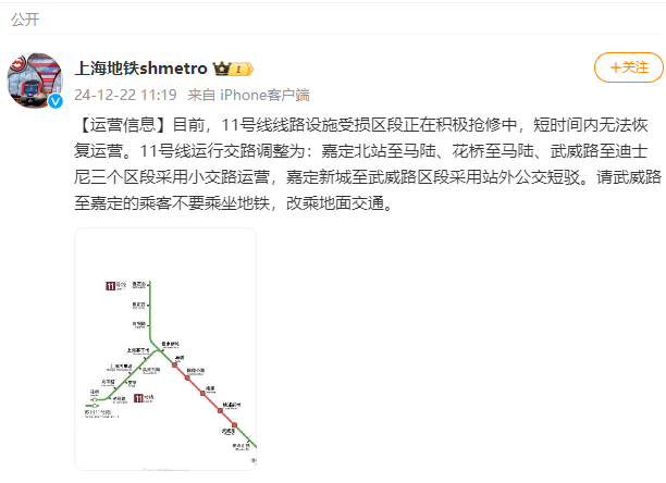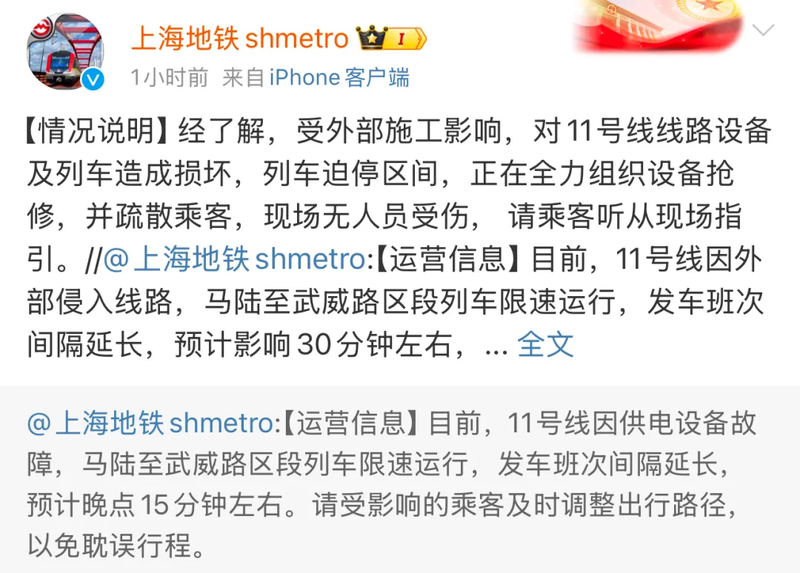 “由于外部塔吊施工侵入线路,造成11号线线路设施和列车受损,目前正在处置中。由于现场情况复杂,抢修时间预计较长,武威路至嘉定方向的乘客请不要乘坐11号线,请改乘地面交通。武威路往市区方向可乘坐11号线。”