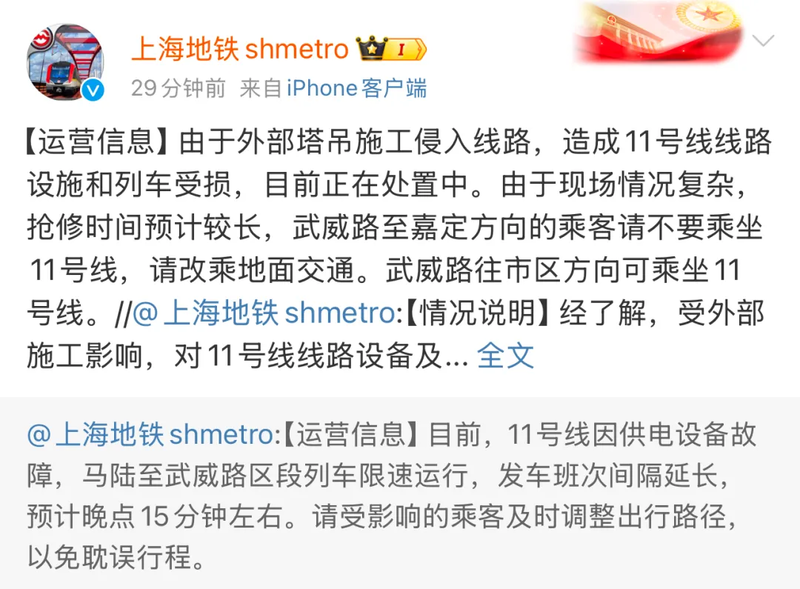 | 据“上海地铁shmetro”消息,12月22日早上,由于外部塔吊施工侵入线路,造成11号线线路设施和列车受损,现场无人员受伤。 另据南方+报道,记者获取到的现场画面显示,22日上午,正在运行中的上海地铁11号线,被一座倾倒的红色塔吊砸中,导致地铁窗户被砸碎。 ![]() 22日上午8时,上海发布消息称:“11号线因外部设备侵入线路,马陆至武威路区段列车限速运行,发车班次间隔延长,请受影响的乘客及时调整出行路径,以免耽误行程。” ![]() 随后,上海地铁再次发文称:“经了解,受外部施工影响,对11号线线路设备及列车造成损坏,列车迫停区间,正在全力组织设备抢修,并疏散乘客,现场无人员受伤, 请乘客听从现场指引。” ![]() 9时46分,上海地铁再次发文,公布了故障原因,并提醒武威路至嘉定方向的乘客不要乘坐11号线。 “由于外部塔吊施工侵入线路,造成11号线线路设施和列车受损,目前正在处置中。由于现场情况复杂,抢修时间预计较长,武威路至嘉定方向的乘客请不要乘坐11号线,请改乘地面交通。武威路往市区方向可乘坐11号线。” ![]() 对于11号线的故障,上海地铁称:“受11号线故障影响的乘客可通过上海地铁官网运营专页获取致歉信,给您出行带来不便,深表歉意!” ![]() 有网友在社交平台上留言:万幸没人受伤!要抓紧抢修啊! ![]() 12月22日早上,上海一施工塔吊倒在11号线地铁线路上,随后被一辆地铁列车撞上。当天下午,极目新闻记者实探“地铁撞塔吊”现场看到,受损地铁列车被拖走,损坏的地铁线路和电力设备仍在抢修中,侵线的塔吊为上海城投一项目施工方所有。 ![]() 地铁线路抢修现场 22日中午12时40分许,记者乘坐上海地铁11号线从迪士尼往嘉定北方向,列车运行至武威路站停车后,车厢内灯光变暗,停车时间较长。站内广播称,受外部施工影响,继续前往嘉定北、花桥方向的乘客,需下车前往1号出口乘坐短途接驳车,现场有地铁工作人员指挥乘客前往出口乘车。 一名地铁站工作人员介绍,列车抵达武威路站后会原路返回。上海地铁公开运营信息显示,地铁11号线马陆站至武威路站区间无法乘坐。 记者在武威路地铁站1号口外看到,马路边停有一排公交车,负责免费接驳继续向嘉定方向的乘客,大量乘客正排成长队上车。 ![]() 武威路地铁站1号口处的接驳公交车 22日下午2时30分许,极目新闻记者在事故现场看到,11号线往嘉定方向距陈翔公路站约200米处,受损的地铁列车仍停在原地,被塔吊砸开超过5米长的线路护墙缺口仍未修复,大量线路和电力设备抢修人员正在紧张施工。下午2时50许,损坏的地铁列车被牵引车拖离现场。 ![]() 抢修现场的工作人员 极目新闻记者在塔吊倒塌的工地现场了解到,该施工项目为上海城投沪嘉高速与闵嘉高架联络线新建工程,现场可见有部分受损的塔吊倒在地上,上方压有损坏水泥块。现场一名工作人员介绍,该项目总包方是上海建工。 据现场施工公示,工程建设单位为上海公路投资建设发展有限公司;设计单位为上海市城市建设设计研究总院(集团)有限公司;监理单位是上海市市政工程管理咨询有限公司;施工单位为上海建工集团股份有限公司。 ![]() 塔吊砸坏的地铁护墙缺口 极目新闻记者致电上海城投公司咨询此事,工作人员表示,将向领导汇报后回复记者,但截至发稿,记者未收到回复。 上海市嘉定区应急管理局工作人员回应极目新闻记者称,现场已成立应急、地铁、交通委、施工方等部门成立的联合调查组,正在现场调查。至于侵线塔吊所属的项目及施工方等详情,该工作人员表示还在核查中。 |