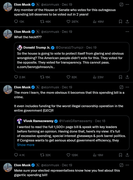 在上周末举行的美国陆军-海军橄榄球赛上,埃隆·马斯克发布了一张球场上方巨型屏幕的照片,照片中四张脸清晰可见。当选总统唐纳德·特朗普、当选副总统 JD 万斯和马斯克都看着镜头。背景中,低头看去的是众议院议长迈克·约翰逊。![]() 这张照片的象征意义,以及马斯克发布的这张照片的行为很难不让外界浮想联翩。马斯克直接站在特朗普和万斯身后,比议长(总统第二顺位继承人)更显眼。 几天后,马斯克对他新获得的政治权力做出了最具影响力的展示,用X平台的150多条帖子让约翰逊提出的一项支出法案遭到否决。该法案原本得到了两党的支持,旨在为政府提供资金并避免出现政府关门。然而,马斯克的搅局成功让国会山陷入混乱。头疼的约翰逊只能无奈调整法案,并最终踩着周五的最后期限才得到通过。 半夜搅局 9 月底,国会投票通过了一项临时支出法案,为政府提供资金直至 12 月 20 日。当时正值选举前夕,两党都不想发生大规模的预算之争。国会领导人认为,通过将辩论推迟到 12 月,即国会“跛脚鸭”会议期间,可以相对顺利地处理此事。但事实证明,他们错了。 本周二,约翰逊公布了一份长达1,547 页的支出法案。法案的目的是为政府提供资金直至 2025 年 3 月,但这也是华盛顿进行老式讨价还价的机会。两党议员在该法案中增加了数十项额外条款,其中包括一项与华盛顿特区的 NFL 体育场有关的条款、一项多年来首次为国会议员加薪的条款以及一项为重建巴尔的摩 倒塌的弗朗西斯·斯科特·基大桥提供资金的条款。所以,这份法案也被国会山称为“圣诞树”,因为立法者被允许在上面悬挂自己的“私货”。 ![]() 正是数十项不太突出的项目,引起了马斯克、拉马斯瓦米和保守派议员的愤怒。据知情人士透露,有共和党议员联系了马斯克和拉马斯瓦米,表达了他们对原始法案支出提案的担忧。特朗普的顾问私下抱怨说,约翰逊没有充分向他们说明该计划的全部内容。周二和周三,约翰逊在群发信息中试图向拉马斯瓦米和马斯克解释这项法案,但并没有缓解他们的担忧。 马斯克认为众议院议长约翰逊谈判的融资协议包含过度支出和特殊利益项目。所以,美东时间周三凌晨4点15分,马斯克在社交媒体X上发帖称:“这项法案不应该通过。” 这是马斯克发表的关于反对该法案的第一条推文,接下来的一天内他狂轰乱炸了150多条。 马斯克不断发帖抨击这项法案,称是分猪肉,他说:“见过更大块的猪肉吗?” ![]() 他还鼓励美国民众参与其中,让支持者们打电话给他们地区的议员代表,“停止偷走你们的税金的行为吧!现在就给你选出的代表打电话。他们今天正试图强行通过这项法案!” 马斯克还对投票支持该法案的国会议员发出了选举威胁。“任何投票支持这项荒谬支出法案的众议院或参议院议员都应该在两年后被投票淘汰!” 特朗普没有立刻发声 在马斯克发表强烈抗议后,议员们一直在等待特朗普发表讲话,想知道马斯克和拉马斯瓦米在社交媒体上的愤怒言论是否反映了这位当选总统的立场。直到周三下午 4:28,也就是马斯克在社交媒体上对该计划发起攻击 12 个多小时后,特朗普终于发表声明表示反对该法案,称该法案是“对我们国家的背叛”,并且也首次公开要求将提高债务上限作为支出协议的一部分。 ![]() 最终,这项法案不出意外的胎死腹中。民主党批评共和党人废除了这项两党协议,为可能的政府关门铺平了道路。威斯康星州民主党众议员格温·摩尔在 X 的一篇帖子中说:“共和党人再次在唐纳德·特朗普及其亿万富翁俱乐部的授意下,将美国推向了政府关门的边缘。” 马斯克则庆祝道:“人民的声音胜利了。”CNN说更准确的说法可能是马斯克的声音取得了胜利。 ![]() 当国会山陷入混乱时,引爆这一切的马斯克还在海湖庄园和特朗普一起与亚马逊创始人杰夫·贝佐斯共进晚餐。第二天早上,特朗普在 Truth Social 上发帖称,每个人都想成为他的朋友。 “影子总统”马斯克 在特朗普出面反对之前,马斯克的施压行动在周三全天都展现得淋漓尽致。马斯克前所未有的网络影响力似乎完全破坏了这项支出法案,这是任何共和党议员在国会山内部都无法做到的。马斯克对政府支出和政策的影响力比最初预想的要大得多。 马斯克表示,这一努力可能只是他作为政府效率部(DOGE)联合部长所扮演的积极分子角色的开始。马斯克明确表示,他将对付华盛顿任何他认为在削减开支方面做得不够的人,即使这意味着要与共和党人对抗。他在 X 上写道:“除非 @DOGE 结束那些虚伪、贪得无厌的政客的职业生涯,否则浪费和腐败将永远不会停止。” “因此,除了这样做别无选择。我希望还有其他办法,但没有。” ![]() 总的来说,马斯克在支出法案上的争执对国会共和党人来说是一个早期预警信号:要么加入,要么出局。肯塔基州共和党众议员安迪·巴尔说道:“我们的选民,选举我们的人,正在听埃隆·马斯克说话,今天我的电话响个不停。” 甚至有两党人士直接称马斯克才是总统。华盛顿州民主党众议员普拉米拉·贾亚帕尔在X上说:“很明显谁是负责人,而这个人不是当选总统唐纳德·特朗普。影子总统埃隆·马斯克整天都在抨击共和党的持续决议,成功否决了该法案,然后特朗普决定效仿他的做法。” 前伊利诺伊州共和党众议员亚当·金辛格在 CNN 上表示:“马斯克总统明确