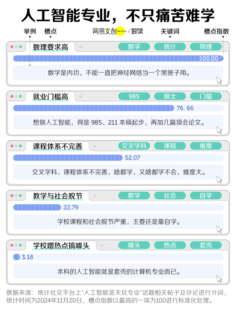| 如今,甭管是 ChatGPT 还是国产 Kimi、豆包,都很难再带给大家横空出世时的“亿点点”惊艳。 技术震撼已成过去时,取而代之的是搞钱狂热——脑子活络的用 AI 写作绘画,搞副业赚外快;深谙贩卖焦虑套路的博主,则造人设做知识付费,被戏称“AI 时代第一桶金都被卖课的赚去了”。 一众互联网大厂们也在招贤纳士,这一次,年薪百万的好福气轮到了算法工程师的头上。面对如此时代红利,想要分一杯羹的,还有大批冲向爆款人工智能专业的学生。 不过,读人工智能专业究竟是高前景还是高风险?本科四年学习,个中滋味又如何? 人工智能专业,高校新宠儿 高考结束选专业,宛如一场赌博。成绩分数、学校层级、专业前景,无一不是决定未来四年的关键变量。 很多考生既不愿浪费一分,但未经世事又不知道该选什么,最后往往是看时下什么行业前景好、薪资高就匆匆跟风上车,人工智能便是其中一个。 作为新兴专业,人工智能其实是以计算机科学为基础,又交叉融合了神经和认知科学、数学、心理学等多学科 ,属于工学下的电子信息类 [1]。 但国内对于人工智能人才的培养,其实比想象中早得多,在 ChatGPT 震惊世界前,国内就已经开始了智能机器人、虹膜识别、专家系统等多方面的研究,也开始了从研究生到本科生的排兵布阵 [2]。 2018 年,教育部发布了《高等学校人工智能创新行动计划》,同一年,以南京大学、上海交通大学为领头的 35 所高等院校率先开设人工智能本科专业,成为第一批吃螃蟹的学校 [1][3]。 到了 2019 年,更有 180 所高校一拥而上追赶这波热潮,人工智能专业新增高校的数量迅速达到峰值,随后几年呈现下降趋势。截至 2023 年,全国共有 532 所普通高校开设此专业,占到普通本科高校总数的 40.67% [4][5]。 ![]() 不过新增人工智能专业的高校数量下降,并不意味着人工智能专业“凉了”,而是随着学科布局日趋饱和,新一轮的资源博弈正浮上台面。 今年 4 月和 11 月,教育部先后公布了两批“人工智能+高等教育”应用场景典型案例,共计 50 个案例,其中有 43 个都来自 985 和 211 高校 [6][7]。 当一些开设人工智能专业的双非院校还在“谁来讲课”“讲什么课”中苦苦挣扎时,实力名校已经开始强调技术落地,卷向新的阶段。而这样的局面,其实早在人工智能专业正式入驻各高校学院的时候,就有迹可循。 我们统计了所有开设人工智能本科专业的院校,发现在 532 所高校中,如南京大学、中国人民大学、西安电子科技大学等 85 所选择“自立门户”,整合现有师资与教学资源,成立人工智能学院。 ![]() 更多的普通院校,则是将人工智能专业挂靠在原有的计算机学院、信息工程学院、大数据学院等院系。既方便“就地取材”学院现有资源,也不耽误蹭上热门,好招来生源。 但也有特殊的情况,比如西安工业大学结合自身的军工优势,另辟蹊径将人工智能专业纳入兵器科学与技术学院,研究“智能兵器” [1][8]。 本科四年,学成“多面手” 虽然在外人看来,人工智能四个字听上去总是高深莫测、虚无缥缈,但其实它仰赖的基础依旧是计算机学科。 正因如此,学生想学好人工智能就得成为“多面手”——不仅要数学好,看得懂算法公式的底层逻辑;又要足够了解计算机,具有较强的编程能力;还得学机器学习、自然语言处理、深度学习等课程,设法教会计算机像人脑一样思考。 可以说,就读计算机专业学生会吃的苦头,人工智能专业的学生也要跟着吃一遍,甚至更多。 比如写课后作业,学生们不是当“代码裁缝”,去 CSDN、Stack Overflow 等专业论坛里找代代相传的答案;就是当“江洋大盗”,打劫大佬的代码,试图蒙混过关,开一百个标签页就为解决一个非常简单的文件读写或者环境配置问题。 ![]() 而学生 debug 时更是血压一次比一次高,披星戴月熬夜到凌晨三四点是家常便饭,最后发现不是代码跑完但忘记改目录,就是运算平台显存不足,独留自己和“No such file named”“CUDA Out of memory”等各种报错在风中凌乱。 更惨的是,在许多层次偏低的高校,课程体系设计并不完善,只是照葫芦画瓢开设了人工智能导论、机器学习等基础课程,学生四年所学不仅杂乱还肤浅,被吐槽是只会数据炼丹的“调参侠”: 我们就是把计科和电子的专业基础课都学一遍,再把机器学习“西瓜书”拿出来粗略讲一讲,最后敲代码不如计科,做芯片又不如电子,多而不精,面面蜻蜓点水,每一样都差距甚远。 究其原因,由高校人工智能相关专业老师学生等创建的开源组织 Datawhale 发布的《2023 中国人工智能人才学习白皮书》就指出,人工智能人才培养错位的三个主要问题就是:缺实践、教学内容过时与教学方式固化 [9]。 ![]() 像关于人工智能发展史、机器学习原理这样的理论课程,教师可以很快上手教课,但是,让不熟悉 AI 实操的老师们指导一个应用落地,大家就犯怵了。最后学生被老师“半散养”——杂活是要做的,但指导和资源是没有的: 问导师问题只会告诉我“多看看文献,自己看着办”,从不正面回复我的题目是否可行,还夹杂着点 PUA 的话。 双非资源一般,而整个实验室只有两张 3090 显卡,你觉得够一组人做计算机视觉吗? 结果往往是,老师上课对着前三排的空气大谈空中楼阁,后排的学生则低头在微信群里蛐蛐“老师讲得像唐僧念紧箍咒,听得脑子都要爆炸”。 梦中情职,距离甚远 B 站的课越看越多,leetcode(用于编码面