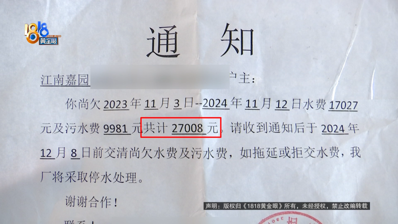 | 郭先生介绍 父母住在杭州桐庐江南嘉园小区 他在富阳上班 偶尔也过来 房子是前几年买的 房龄十来年了 家里一年抄一次水表 上个月发现 因为表后的水管破裂 一年走了一万多吨的水 这笔天价水费让他犯了愁 ![]() 郭先生:今年抄水表的时候,水表就跑到了一万多吨,水厂说让我们承担这个水费一共是27000多块钱。 记者:当时抄水表的时候是什么情况,您在吗? 郭先生:抄水表的工作人员就讲,可能是地下的水管破掉了,因为是表后,跑掉的水费你们业主自己承担。 记者:水表多久抄一次啊? 郭先生:正常是一个月抄一次,他一年抄一次也不知道什么原因。 ![]() 小区没有地下室 整个单元的水表都在一楼楼梯间里 郭先生提供了挖开水表周围地面的视频 水流从底下的一根水管里喷涌而出 拿出的这根水管 侧面有一道裂痕 目前 水管已经修好了 郭先生家的水表 定格在了11866吨 记者问了问AI 一个三口之家一般一年用100吨不到的水 按这个结果推算 郭先生家从去年11月到今年11月 跑掉的水量已经是一般家庭的100多倍 郭先生:正常一年用也就两三百块钱,一下子跑了两万多,肯定不能接受。所以说看政府能不能协商一下,因为这个小区也是没人管,没人问。 记者:小区有物业吗? 郭先生:没有物业,现在就是说开发商也没有。比如说要是一个月抄一次,跑掉的水,跑多了我们该承担肯定要承担。你说一年抄一次,跑这么多水费肯定有点吃不消的。 ![]() 桐庐县窄溪自来水厂 此前给郭先生发来通知 水费和污水费共计27008元 要求12月8号前交清 郭先生说 这笔水费实在有点昂贵 现在家里已经断了水 卫生间里放了不少脸盆和桶装水 再看一楼的这些水表 大部分都蒙了灰尘 郭先生说 大家平时都不会特意来看 此前 他和自来水厂方面协商过 ![]() 桐庐县窄溪自来水厂 徐厂长:开发商主体房子的水管,做了没做好,他也看到了,管子裂开了。 记者:这种情况如果一个月抄一次,肯定损失就小一点嘛。 桐庐县窄溪自来水厂 徐厂长:一个月抄一次,我们不是代扣的,我们工厂的人要上门的。你说江南镇这么多小区,你说一个月抄一次,这个工程量你说。正常用一个月几吨水,两三吨,四五吨,十来吨水,这个工程去抄水表,你也谅解,不可能去抄的。我也不回避这个责任,我意思说一年来抄水表,我们也有责任。 郭先生:家里面也是在厂里打打工的。 桐庐县窄溪自来水厂 徐厂长:我理解你们,我也减免了,给你们一半了将近,你要再减免,我怎么减免呢? ![]() 郭先生说 目前协商下来 他还得付一万多元水费 他想问问 既然是开发商的管子破了 能不能找到开发商呢? ![]() 杭州市桐庐县江南镇城建办 袁主任:这个我说实话,20多年了开发商我们也联系不到了。 郭先生:我一直在富阳那边,今年我妈说水费跑一万多吨,吓都吓“死”了。 杭州市桐庐县江南镇城建办 袁主任:水厂也明明确确的,你这个问题处置到现场我们都去的,水厂是代收代缴的,它也没有权利免掉。 ![]() 镇里城建办的袁主任帮忙咨询了桐庐水务 对方表示 水管已经超出了质保时间 如果郭先生对责任认定还有疑问 建议通过法律途径解决 |
