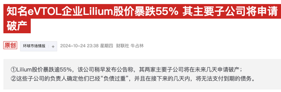作为这个概念最早一批的网红企业,Lilium还曾被称为“飞行汽车界的特斯拉”,部分原因是特斯拉主要股东Baillie Gifford是这家公司的主要投资人。同时,中国股民了解这家公司,也与腾讯参与公司多轮融资有关,有统计称腾讯大概投了近40亿人民币。 当然,早期投资者都与公司一同见证过辉煌时刻——Lilium在2021年9月15日通过“借壳上市”登陆美股市场,市值最高超过70亿美元,按照当时的汇率差不多接近470亿人民币。 早早出名、上市也搞定了,但最关键的问题——商用化飞行载具的进展一直不顺利。 作为最早一代的“飞行出租车”公司,Lilium直到把帐上的几十亿美元烧完,也没完成载人飞行试验。同时,公司坚持的“电涵道风扇”等技术路线,也与目前“低空经济”领头羊们有所不同,续航、成本和商业化前景都存在巨大的不确定性。 随着今年德国政府拒绝为Lilium提供融资担保,公司10月底宣布进入破产程序。之后Lilium迅速被交易所摘牌,退到鱼龙混杂的粉单市场进行交易。