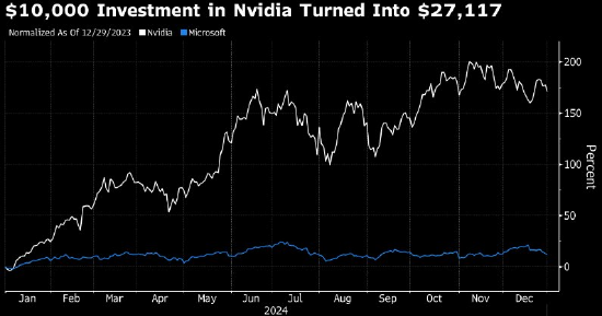 英伟达:27117美元 2024年虽然对人工智能变革潜力的热情提振了整个美国大型科技股,但芯片制造商英伟达显然是明显赢家,如对英伟达投资10000美元年底会变成27117美元。相比之下微软则表现落后,投资收益仅会增加1209美元。