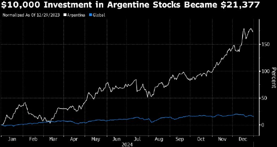 阿根廷股市:21377美元 数据显示,2024年阿根廷Merval指数在全球92个主要股指中表现最佳。这反映了投资者对该国总统米莱平抑通胀、扭转多年来普遍存在的预算赤字的努力持乐观态度。如果将1万美元投入该该国股指,经汇率波动调整后将变成21377美元。