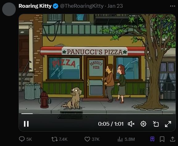 美股散户的“带头大哥”Keith Gill,也被称为“咆哮小猫”,在周三晚上发布了他今年的第二条社交媒体帖子,引发了关于这条隐晦帖子可能含义的猜测。 该帖子发布在X(原Twitter)上,包含了一段来自科幻动画系列《Futurama》的剪辑。这段视频来自名为“Jurassic Bark”的一集,展示了一只忠诚的狗长时间无果地等待它的主人,最终死去。投资者和交易者的社交平台Stocktwits在周三晚上也在X上写道,“他回来了”。 ![]()