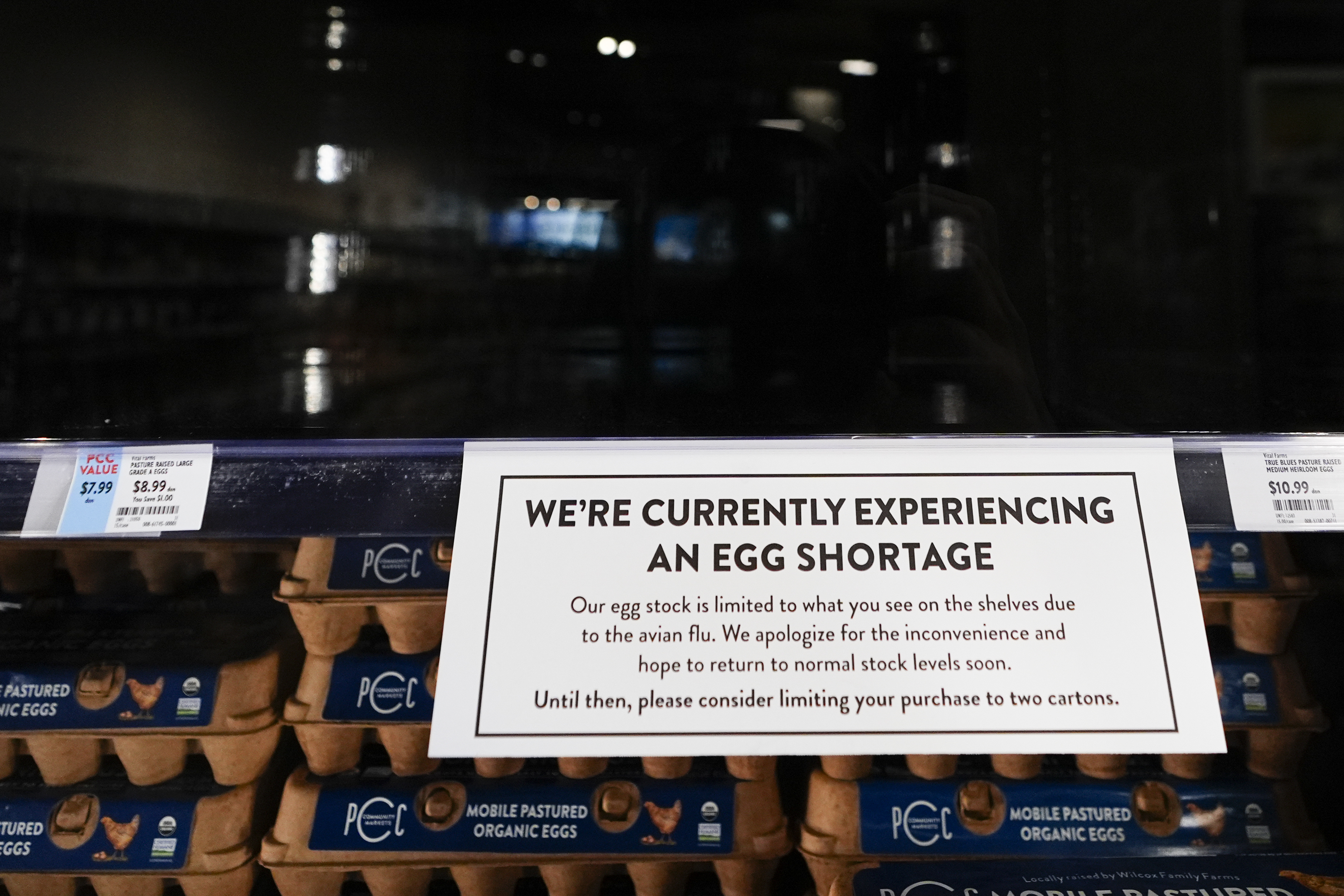 每当在家禽农场检测到该病毒时,整个羊群都会被屠杀以限制其传播。 由于大型商业蛋农场经常容纳超过一百万只鸡,只有几种感染会导致供应紧缩。然后,农民必须处置尸体,对谷仓进行消毒并带来新鸟类以恢复生产。 结果,消费者感到在杂货店的捏夹,面临更高的价格,有限的鸡蛋可用性甚至空货架。 一个标志要求客户考虑限制他们在PCC社区市场杂货店购买鸡蛋的原因,这是由于2025年1月27日在西雅图的禽流感造成的短缺。