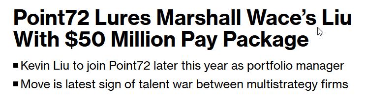 想起自己当年大学毕业,挤破脑袋都想进华尔街投行工作,那时候硅谷科技巨头还没有崛起,苹果才刚刚发布第一代iPhone,华尔街的百万美元年薪算是当时美国主流社会的顶配薪水,虽然现在也是,而且会被视为行业内的精英,特别有面子。对冲基金D.E. Shaw 在 LCH Investments 的 2024 年最佳表现排名中名列前茅。2024 年,D.E. Shaw 为投资者赚取了 111 亿美元,在排名前 20 位的基金经理中名列前茅。 据 LCH Investments 的数据,Citadel 在 2024 年为投资者赚取了约 90 亿美元,在自成立以来的净收益方面排名第一,自 1990 年以来为投资者赚取了约 830 亿美元,年化收益率为 19.5%。今年是 Citadel 连续第三年蝉联第一。 但按年度计算,Citadel 去年排名第三,而 Millennium 在 LCH 排名中也超过了 Citadel,为投资者赚取了约 94 亿美元。根据 LCH 的数据,Millennium现在是前 20 强公司中最大的一家,管理着 740 亿美元的资产。据熟悉两家基金的人士称,Millennium基金去年的收益率为 15%,略低于 Citadel 的多策略惠灵顿基金的 15.1%。 Citadel是对冲基金,而旗下CitadelSecurities是是全球最大的做市商之一,致力于提高交易的效率和透明度,利用高频交易技术来实现快速交易。 由北大天才少年赵鹏担任CitadelSecurities的CEO 赵鹏绝对是国内不折不扣的学霸:10 岁进入少儿班,14 岁考上北大数学系;在美国加州大学伯克利分校博士毕业后入职 Citadel Securities,不到十年就坐上了 CEO 的位置。 ![]() 50,000,000美元挖走他 今天的主角是另外一家资产管理公司,Point72由史蒂夫-科恩(Steve Cohen)创立,根据最新消息,公司已经聘请了(Marshall Wace)的投资组合经理华裔男子 刘凯文(Kevin Liu),并承诺提供至少 5000 万美元的薪酬。 ![]() ![]() 其中一位知情人士说,总部位于纽约的刘凯文将于今年晚些时候加入 Point72,担任多空股票投资组合经理,专注于科技、媒体和电信领域。他在 LinkedIn 上的个人资料显示,Liu 在 Marshall Wace 工作了约 8 年,最近的职务是投资组合经理,主要负责全球 TMT 投资,在此之前,他曾在摩根士丹利工作担任分析师。 上述人士表示,刘的薪酬数字包括一份多年期合同、他因离开 Marshall Wace 而损失的薪酬以及其他注意事项。这些人士说,这一总数的部分原因是其他公司竞相挖角他。 Point72 和 Marshall Wace 的代表拒绝发表评论。 Point72的高价招聘是对冲基金之间激烈的人才争夺战的最新迹象,许多交易员选择在一家巨头公司领取签约奖金,而不是创办自己的基金。5000 万美元或更高的薪酬已经变得越来越普遍,包括 Balyasny 资产管理公司,该公司去年开始了超过 2 亿美元的招聘狂潮,从 Point72 等竞争对手那里挖人。 Point72 的网站显示,截至 1 月 1 日,该公司管理着约 369 亿美元的资产。 |