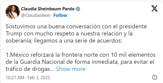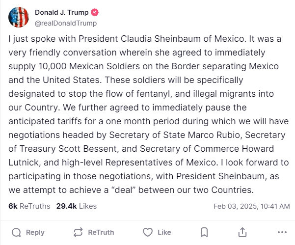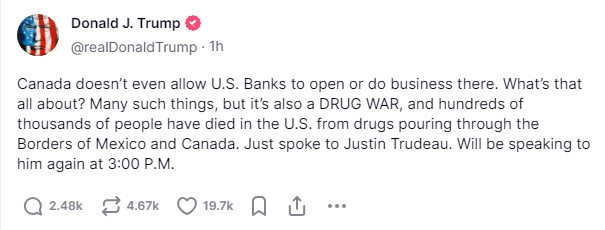 加拿大总理杜鲁多于今天周一清晨与美国总统特朗普通话,讨论即将爆发的贸易战。这场冲突可能给两国工人和企业带来严重经济损害。两位领导人预计将在今天下午再次通话。![]() ![]() 图源:CTV News 加拿大总理办公室(PMO)和白宫尚未发布正式通话记录,但特朗普随后在社交媒体上批评加拿大,称其不允许美国银行“进入或在加拿大开展业务”。 事实上,多家美国银行已在加拿大运营,包括大型贷款和投资银行业务。 特朗普在社交媒体上宣称:“这不仅仅是贸易战,这也是一场毒品战争。数十万美国人因从墨西哥和加拿大边境流入的毒品而丧命。” ![]() 图源:truth social 美国政府数据显示,美加边境近年缴获的芬太尼(Fentanyl)数量极少,而特朗普此前曾表示芬太尼是他最关心的问题。尽管两国在多个问题上明显对立,特朗普仍表示将在今天下午3点再次与特鲁多通话。 白宫国家经济委员会主任Kevin Hasset今天在CNBC采访中表示,墨西哥已“认真对待”特朗普的关税行政令,但加拿大“误解了”这一政策。 Hasset说:“我们在周末的对话中发现,墨西哥人对特朗普总统的要求非常认真。但加拿大似乎误解了行政令的明确措辞。” 当被问及加拿大和墨西哥必须做什么才能取消关税时,特朗普周日告诉记者: “他们必须平衡贸易,这首先是最重要的。” “他们必须阻止人们涌入我们的国家……他们必须阻止非法移民,我们必须阻止芬太尼。这包括中国。” 加拿大保守党领袖博励治(Pierre Poilievre)周一发布视频,详细介绍他的“加拿大优先”(Canada First)计划,包括推动标准化卡车运输规则,以提高跨省运输效率;创建统一的职业认证标准,让医生、护士和工程师能在全国范围内自由执业。 加拿大总理办公室(PMO)宣布,杜鲁多周日已与欧洲理事会主席Antonio Costa通话,讨论特朗普关税问题。 官方通话记录显示:“总理与欧洲理事会主席讨论了美国关税措施以及加拿大的回应。双方领导人强调,持续合作对于促进两岸人民的安全和经济繁荣至关重要。” 与此同时,杜鲁多将与加拿大-美国关系委员会(Council on Canada-U.S. Relations)会面,讨论即将生效的关税及美加贸易战的影响。 美对墨西哥关税暂停一个月墨西哥总统谢恩鲍姆(Claudia Sheinbaum)在X平台上用西班牙语发文,宣布美国已同意从现在起暂停关税一个月。 ![]() 图源:X 她表示,她与团队刚刚与特朗普进行了“良好的对话”,并达成了一系列协议。 墨西哥总统谢恩鲍姆概述了她所称的墨美协议内容,该协议将暂缓实施关税。 墨西哥将在北部边境部署1万名国民警卫队成员,主要任务是拦截芬太尼等毒品流入美国。 作为交换,美国将采取措施阻止高性能武器流入墨西哥,并暂停对墨西哥商品的关税一个月。 美国总统特朗普也在他的社交平台Truth Social上发文,表示他将亲自参与美墨谈判,并称:“我们正在努力为两国达成协议。” ![]() 图源:truth social |
