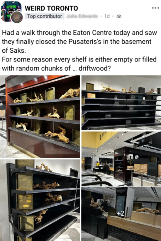 图源:BlogTO@Hector Vasquez 有网友晒出照片并写道:“今天在Eaton Centre闲逛,看到他们关闭了Saks地下的Pusateris。几乎每个架子都是空的,摆满了木雕???”