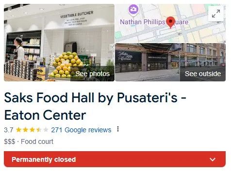 图源:Retail Insider 这一独特的美食空间是Saks Fifth Avenue进军加拿大市场的重要一环。Saks Fifth Avenue曾于2016年接管Hudson’s Bay超16.9万平方英尺的空间,也是同一时间,该美食广场惊艳亮相。 然而,在经营了近10年后,Saks美食广场也撑不下去了...... 疫情重创:关店危机显现! 该美食广场由本地高端连锁超市Pusateri's经营,并与多伦多市中心的知名地下街PATH相连,曾被寄予厚望。 在社交媒体上,不少华人也都推荐过 ↓