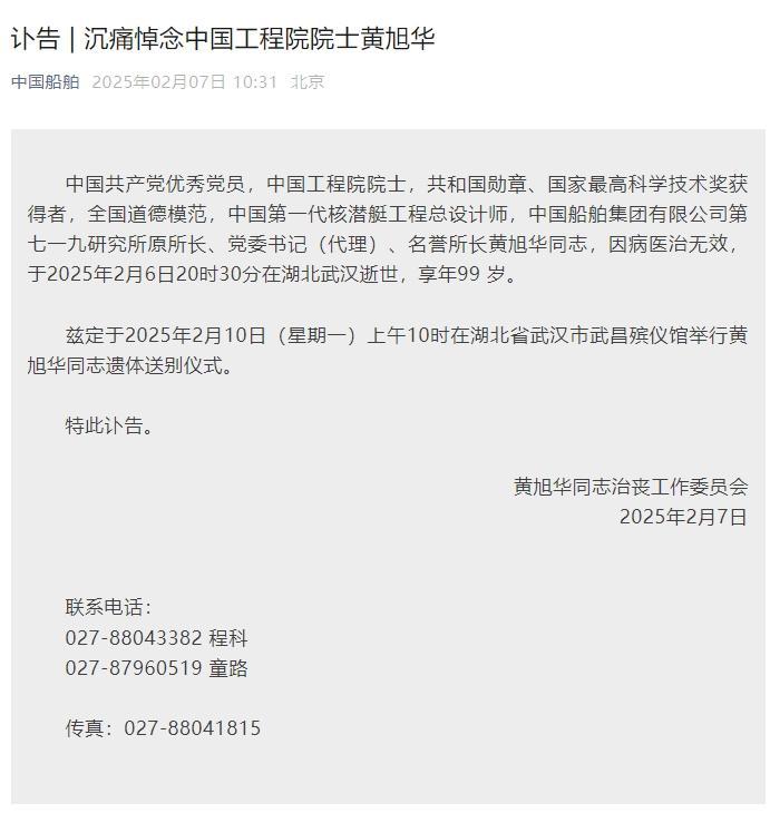 据中国船舶微信公众号消息,中国共产党优秀党员,中国工程院院士,共和国勋章、国家最高科学技术奖获得者,全国道德模范,中国第一代核潜艇工程总设计师,中国船舶集团有限公司第七一九研究所原所长、党委书记(代理)、名誉所长黄旭华同志,因病医治无效,于2025年2月6日20时30分在湖北武汉逝世,享年99 岁。