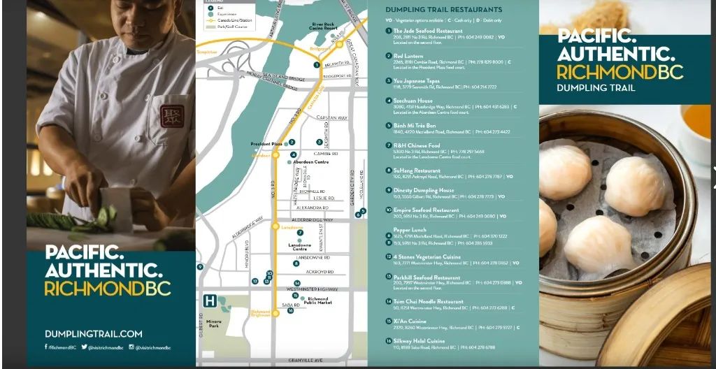 Visit Richmond BC/Website 如果对列治文的餐厅不甚了解,那可以跟随列治文旅游局设计的 "饺子之路(Richmond Dumpling Trail)" 找到宝藏餐馆品尝这一美食。 "饺子之路"是一种自助式美食体验活动,包括列治文15家不同的餐馆,种类繁多。列治文旅游局设计了几条不同的路线,您可以决定自己想要品尝什么类型的饺子。 可供选择的路线包括 "隐藏的瑰宝"路线、"环游世界 "路线、"正宗中国餐饮"路线和 "最佳早茶"路线等等,跟随这些路线上的餐厅品尝饺子,不用害怕会踩雷,可以放心地尽情享受饺子的美味。