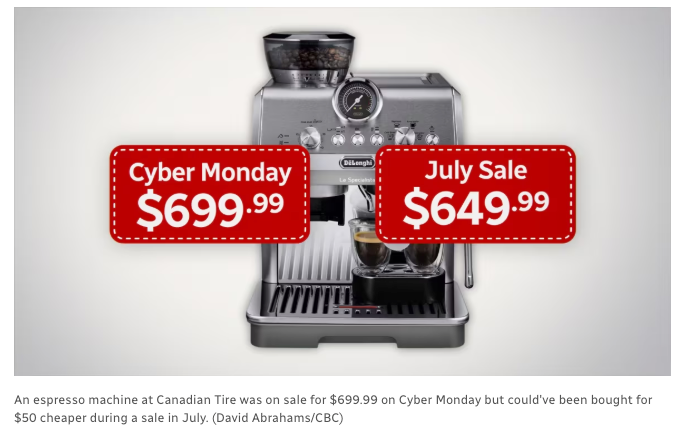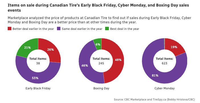 Canadian Tire:大促期间并非最低价 调查团队 7 个月 内跟踪 46 件 Canadian Tire 商品,对比早期 Black Friday、Black Friday week、Cyber Monday 和 Boxing Day 促销与全年其他折扣。 调查结果显示,46 件商品中,20 件在大促期间打折,但超过一半的折扣商品,在大促之前的某个时间点更便宜。