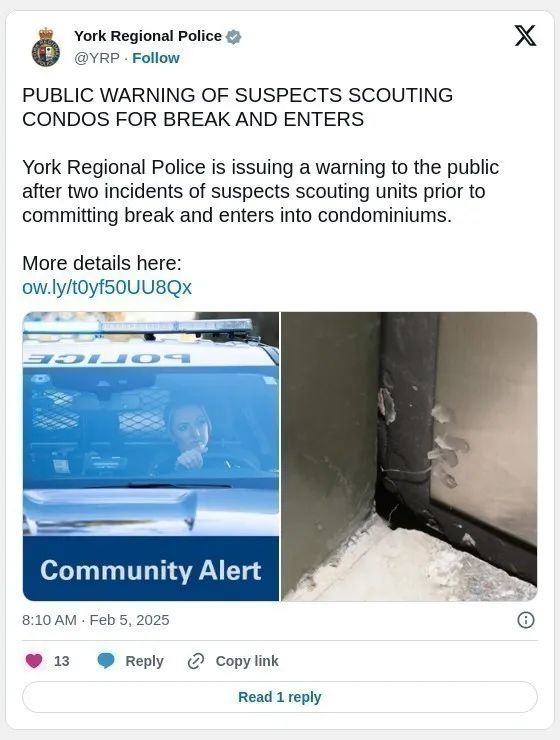 约克区警方向公寓居民发出警告,据称有嫌疑人用胶水粘在门上以便“侦察”公寓单元,随后实施入室盗窃。