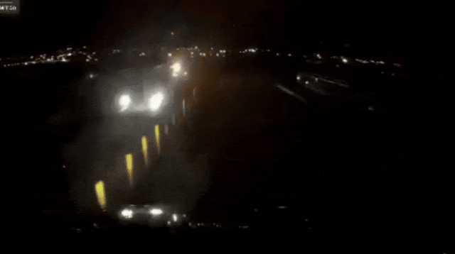 在视频中,卡车正在向南行驶,突然,一辆白色轿车在北向车道上失控旋转并越过中心线,撞上了卡车的前部。
