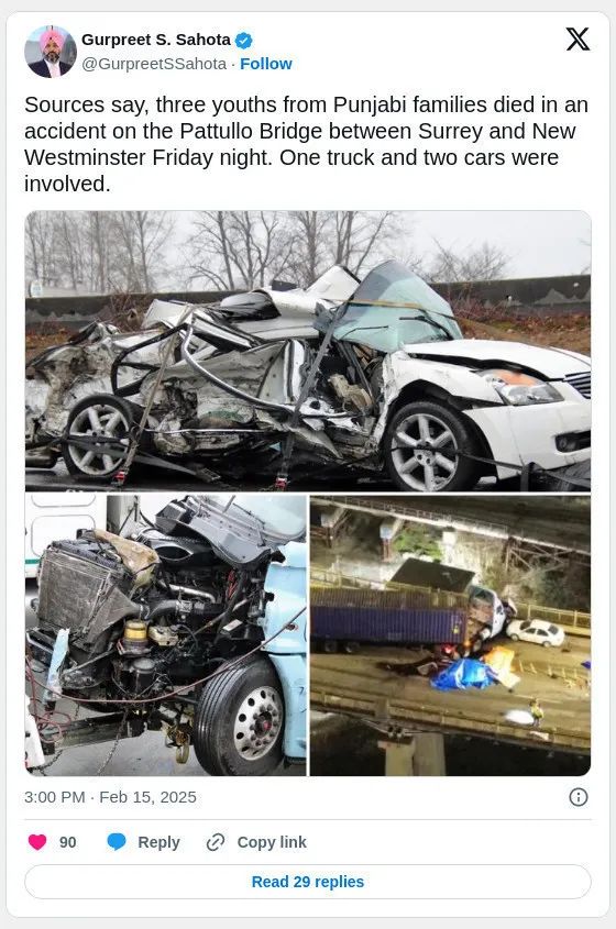 车祸发生在周五晚上 10 点左右,一辆白色私家车越过中间障碍物,与相反方向行驶的半挂卡车猛烈相撞。 车内的三名男子年龄都在 19 至 20 岁之间,当场死亡,而第四名年轻人受重伤,预计将幸存下来。 有消息称,白色私家车上的死者属于一个旁遮普家庭。 半挂卡车的行车记录仪视频现在已经公布。