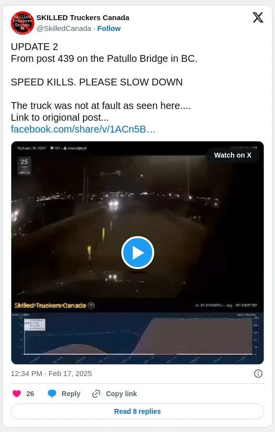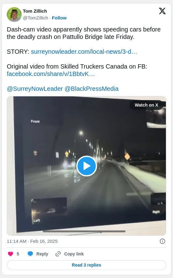 社交媒体上的照片显示,白色私家车损毁非常惨烈。 半挂卡车的司机没有受伤,留在了现场,正在与警方合作。 素里警察局警长林赛·霍顿 (Lindsey Houghton) 表示,调查人员可能需要几天或几周的时间才能弄清楚车祸是如何发生的。 他说:“尝试重现碰撞,即使有视频,也可能非常具有挑战性”。