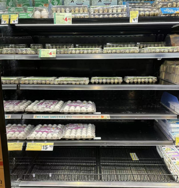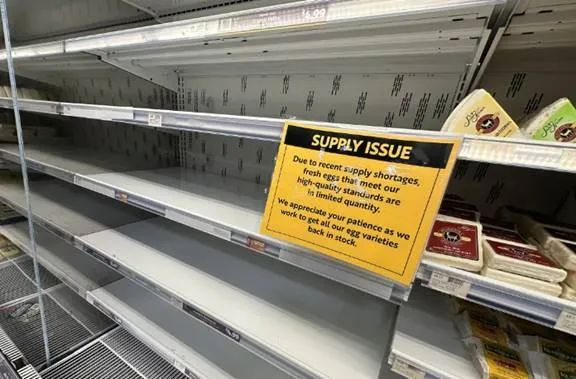 但就在今天,纽芬兰与拉布拉多省的一家“非商业化后院家禽养殖场”爆发疫情,检测出了H5N5 病毒。这个禽流感病区去年就在加拿大流行过了,与 H5N1(2.3.4.4b)谱系有关,曾影响加拿大部分农场。最近这段时间,禽流感病毒在全球广泛传播,已严重破坏家禽养殖业,导致供应链混乱,并推高相关食品价格,且病毒的传播已扩展到哺乳动物,包括奶牛,这引发了各国对人类感染的潜在风险的担忧。先说眼前的蛋价问题,美国市场冲击巨大,超市货架一下子被抢空,甚至有的地方需要限购,就连Costco这样的连锁超市也一样,价格飞涨。美国鸡蛋价格已经上涨150%,加拿大的幅度较小,上涨4%。
