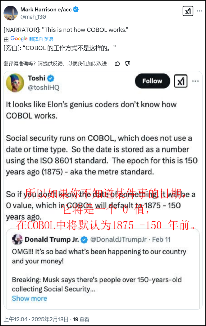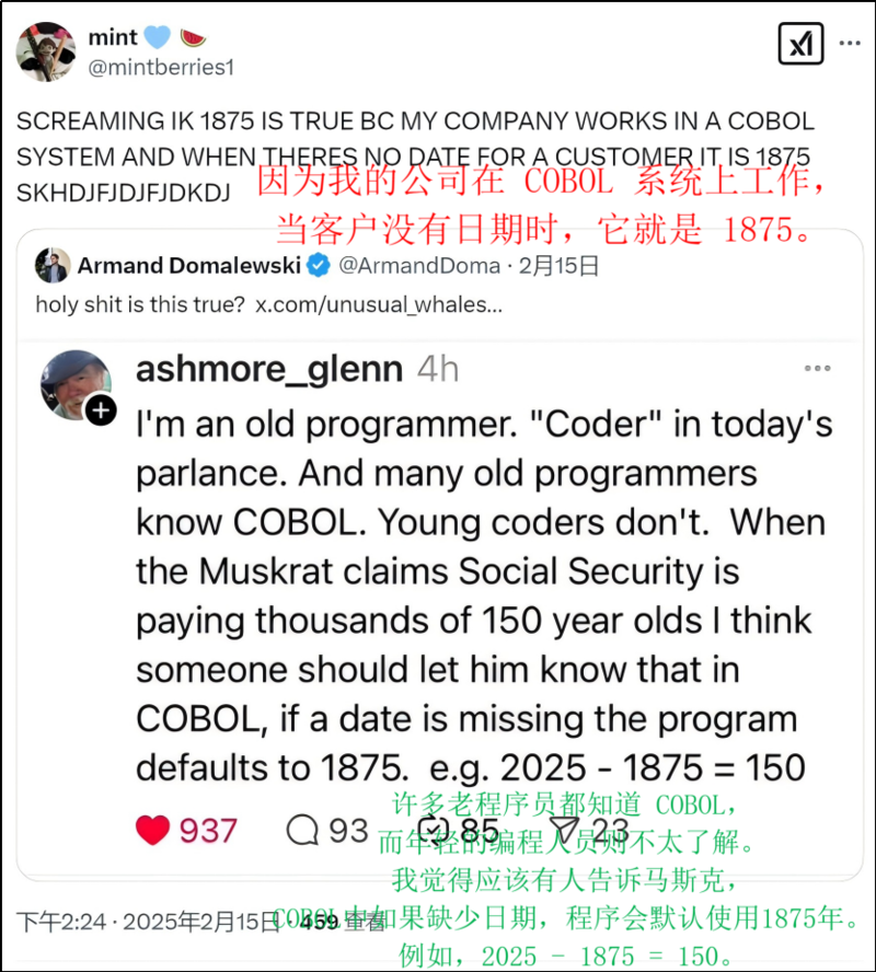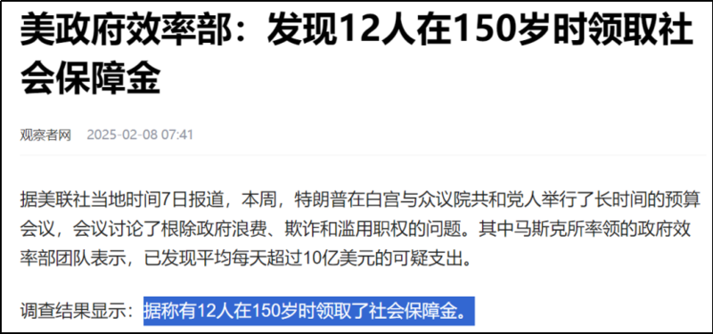 最近,马斯克领导下的政府效率部DOGE又爆出了猛料。他查了查美国社保数据库,得出几个结论:![]() 先是说3.94亿人在美国登记社保。 虽然美国只有3.41亿人,但这数字差的不是特别离谱,那就先忽略吧。 然后说百岁以上老人超2000万。 即使对数字不敏感的人也多少眉头一皱,神经紧绷了。 看不懂没关系,直奔主题。 社保系统里,有人已经150岁了。 更有甚者年龄达到了360岁。 ![]() 这组数据有多离谱呢? 目前全世界最长寿老人终年117岁。 ![]() 美国建国才248年,而360岁的老哥当年就已110岁高寿了。 但他不是全然一个人在战斗。 另一位老哥,差不多从美国建国元年就开始交社保,交到今天,那他堪称美利坚爱国第二人了。 ![]() 考虑到这些情况,美国人均寿命应该世界第一,但2023年美国的人均预期寿命为在全球仅仅排名第58位。 所以这些数据肯定有问题了。 只不过我们的网友比美国人更会吐槽: “在美国,173、184是两个坎,耶稣不收自己走。” ![]() “在美国,220岁左右的人明显比临近年龄段的人多,充分说明了美国独立建国后,出现了人民生活水平大幅提升的现象,造就了第一批婴儿潮。” 吐槽着吐槽着,奔着修仙去了。 ![]() 谁让全世界都看不懂这数据呢? ![]() 在这个问题上,技术圈吵得跟键政圈一样凶。 一种主流观点是,美国社保制度是1935年的产物,相关数据库用的就是COBOL这种古早语言编程的,遇到日期为空的情况,默认为1875年5月20日。 为什么是世界计量日这天,因为这天起,许多国家开始采用国际单位制。 ![]() 按照这样的逻辑,很多程序员觉得老版本COBOL会把默认日期设定为1875-5-20。 这正好解释了社保数据里那么多150岁账号的原因。 为了让理由显得更充分,很多程序员会表示:“我在COBOL系统上工作过,我还不知道吗?” ![]() 另一边,马上有人转发回复说: “我也在这系统上工作过,并不是这样的。” ![]() 为啥? 因为默认1875是谣言,许多数据库都是用1970-01-01作默认日期的。 ![]() 吵着吵着,大家都只是在逻辑上推演,拿不出更有说服力的证据。 直到一位程序员提出了另一种思路。他说: ![]() 我来翻译一下: 1,美国社保数据库的默认日期是1875年,不假;但这跟国际计量日无关。 2,因为美国社保制度从1935年实施,所以需要设定一个默认日期,使得这个日期与最早一批定期领社保的人有关。 3,再考虑必须缴满10年社保这个前提,我们很容易知道,第一批定期领社保的人群是1945年时65岁的群体,也就是1880年出生的人。 4,那也应设定1880,怎么成了1875? 5,因为直接设置1880,意味着系统没有容错空间,所以需要往前提,多5年的容错空间。 6,也就是说日期默认是1875,但不是1875-05-20这种形式,后面没有几月几号。 无论上面哪一种解释,不争的事实是,这些“瑕疵数据”在系统中不断滚雪球式发展,就可能出现大量百岁以上老人、360岁老人的一幕。 要怪就怪政务系统太老,缺乏维护动力。另一边,也不能全怪政务系统,毕竟数据更新不及时的事挺复杂的。 有的人不填出生日期,死亡了,家属也不去注销;同时,美国部门之间信息协调不怎么畅通。 时间久了,这美国社保数据库就变成屎山,越屎还越没人敢动。 即使说到这里,也这不代表问题很大。 因为一个账号150岁以上,不意味着他有资格领社保,甚至不能说明他还活着。 所以技术圈的基本结论是:没人骗保,没人挪用社保资金。 而且自2015年美国社保局就规定,他们不会自动对115岁以上的人发社保了。 ![]() 马斯克团队没核实过这些基本情况,为了整个大新闻就带节奏吗? ![]() 那我们得问问马斯克为什么要挑起这个头。 君不见,马斯克领导的“政府效率部”已经撕逼撕疯了。 他们首先打算关停美国国际开发署USAID,因为马斯克团队用AI核查后发现,美国国际开发署在乱花钱: 例如花费5.2亿美元聘请公司顾问、12亿美元流向“未公开的接收者”、近4000万美元邀请明星到基辅访问。 接着他们优化了教育部,减了9亿美元教育部预算。 还有新闻报道,特朗普已指示马斯克部团队去查美国国防部支出了。 但又有反转了。 一个爆料说美国时间17号白宫宣称马斯克不是政府效率部负责人。 ![]() 这是来自反对者的反击,还是要拿掉马斯克弃车保帅了,又或者是假消息呢。 暂且不知道。 但这些撕逼记录已经表明马斯克打算在社保上大做文章了。 不妨看看这一组鲜明的对比。 百岁老人资料里有大量垃圾数据; 那百岁以下的信息就可靠吗? 百岁老人的人数再多,也没有百岁以下入库者多; 如果骗保挪用,用百岁以下的会不会更有利可图呢? 也更不起眼呢? 所以这次马斯克有没有可能想揭露这些大问题? 接着看。 另一条新闻指出,马斯克发现12人在150岁时领取社会保障金。 ![]() 这数字显然是在原始数据上删繁就简了的,似乎证据确凿。 问题来了,一个涉及普通人切身利益的系统,不去好好维护;同时行政部门大手大脚地把钱花在其他地方,那这个部门真的没有渎职吗? 偏偏这时候,美国社保局长还拒绝交出敏感数据。 ![]() 此地无银三百两啊。 那马斯克有没有可能想揭露这些大问题呢? 都是谜。 也只有未来才知道,当你我在第二层的时候,马斯克是不是在大气层了? ![]() 若要去细查严打,那马斯克有的忙了。 因为美国在贪污腐败上,整出很多花活。 ![]() 比较经典的是美军1280美元的咖啡杯。 ![]() 审计问为什么一买就买400个,回答说塑料手柄容易断裂,没法修补,要替换就用