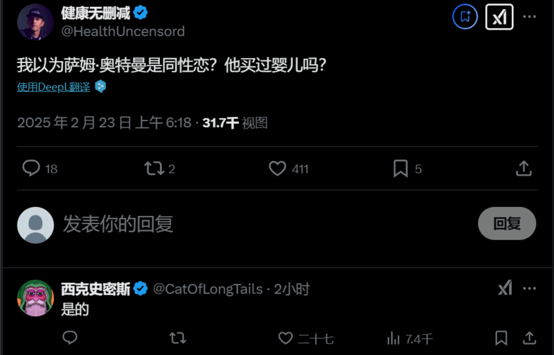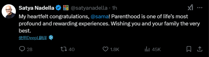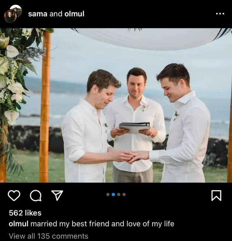 | 2月23日,OpenAI创始人山姆·奥特曼在X平台上发布他刚出生孩子的照片。他说:“欢迎来到这个世界,小家伙!我从来没有感受过这样的爱。”  奥特曼十七岁时出柜为男同性恋,2024年1月,他和软件工程师奥利弗·马尔赫林以犹太礼仪方式结婚。马尔赫林曾是Meta AI部门加州总部的软件工程师,专业领域涉及人工智能与软件开发。有报道称,马尔赫林自2019年起就与奥尔特曼交往,他们平日住在加州旧金山。  婚礼现场照片 网友在评论区与奥特曼开起了玩笑。有网友说:“我以为你是同性恋,这个孩子是买的吗?”  还有网友回复称:“是的,你可以在ali express(国际版淘宝)上买到他们。”  还有网友问:“他什么时候能写prompt?”  当然,除了少部分善意的玩笑之外,许多人为奥特曼送上了祝福,比如微软CEO纳德拉:“衷心祝贺你,山姆!为人父母是人生中最深刻、最有意义的经历之一。祝你和你的家人一切顺利。”  |