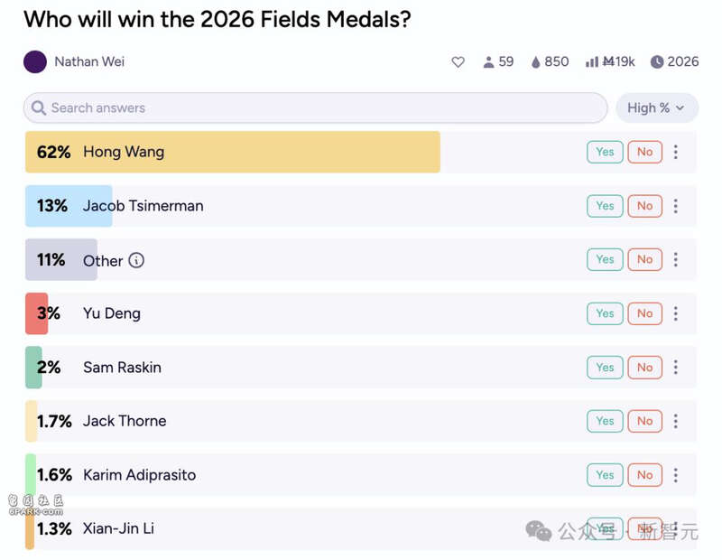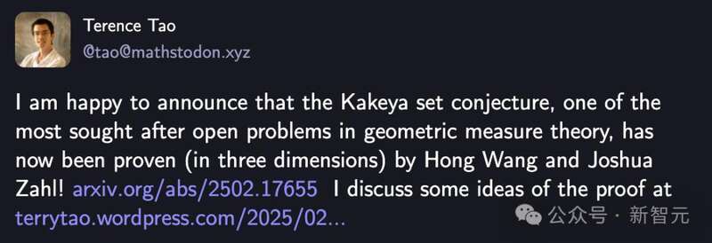 | 2月26日,华人数学家王虹和Joshua Zahl的一篇论文,在数学圈炸开了锅。几何测度论中最瞩目的未解难题——Kakeya集合猜想,已在三维空间中被成功证实!多人猜测:王虹或能锁定下届菲尔兹奖。 一个困扰数学家一个多世纪的超级难题,如今被北大校友攻克了! 最近,纽约大学和不列颠哥伦比亚大学数学教授联手,用一份长达127页证明,正式宣告——「Kakeya集合」猜想尘埃落定。  论文地址:https://arxiv.org/pdf/2502.17655 而且,这项研究得到菲尔兹奖得主陶哲轩极大地肯定,他激动地表示: 在几何测度论中,最受瞩目的未解难题之一——Kakeya集合(挂谷集合)猜想,现在已经被王虹和Joshua Zahl证明(在三维空间中)。  Kakeya集合的核心问题是——如果你要在空间里「转动」一个线段,让它覆盖所有方向,最小的空间需要多大? 挂谷猜想源于日本数学家挂谷宗一(Sōichi Kakeya)1917年提出的一个几何问题 数学家们早已知道,2D平面不够用,必须通过3D空间来解决问题。 但关键在于,能否找到一个「超级小」的3D区域,仍让这个线段指向每个方向? 如今这个谜团,被破解了! 王虹和Joshua Zahl教授通过层层推导,精妙的逻辑和计算,研究了在ℝ³中具有以下性质的δ管(δ tubes)集合:即不会有太多管道被包含在同一个凸集V内。  王虹现任纽约大学库朗数学研究所(NYU Courant)数学副教授,北大数学系本科毕业;Joshua Zahl现任不列颠哥伦比亚大学数学系副教授。 他们得出,来自这样一个集合的管道的并集,必须具有几乎最大的体积。最终证明了ℝ³中的每个Kakeya集,都具有Minkowski和Hausdorff维数3。 一时间,全网忍不住猜测:如果这篇论文最终通过严格的同行评审,王虹极有可能成为中国首位获得菲尔兹奖的数学家,以及全球第三位拿下菲尔兹奖的女性得主。 前两位分别是,伊朗裔美国数学家Maryam Mirzakhani和乌克兰数学家Maryna Viazovska。 作为数学界至高荣耀,菲尔兹奖每4年颁发一次,只给40岁以下的数学家。  王虹一度登上2026菲尔兹奖得主赔率榜首 DeepMind的研究科学家Lechao Xiao震惊表示:之前,从未想过有生之年能看到此猜想被证明。  这一次,中国数学家即将成为开拓者,将在数学史上留下浓墨重彩的一笔。 北大疯人院毕业,学霸典范 提起王虹,不是数学圈内的人,鲜有人知。 1991年,她出生于山水甲天下的桂林。父母都是广西平乐县沙子中学的普通教师,家庭书香氛围浓厚。 然而,命运似乎很早就给这个聪慧的女孩,设置了一大考验。  5岁入学,两次跳级4岁那年,一次意外的右臂烫伤,让王虹遭遇了一场磨难。 但这并没有成为她心里的阴影,更没丝毫动摇她对知识渴望的决心。 入学前,在父母的悉心教导下,年仅5岁的她便已经掌握了一年级的全部知识,凭借超强学习能力,她直接跳级进入了小学二年级。 在学习方式上,王虹有着自己的独特的节奏。她不会等待老师的授课进度,而是习惯在每学期开始前,就将整个学期的课本自学完毕。 面对难题,她也极少直接向老师求助,更倾向于独立思考、查阅资料,或与同学讨论。 这种学习习惯,不仅培养她强大得自学能力,更塑造了其独立思考和解决问题得能力,更为日后的学术研究奠定了坚实的基础。 到了六年级的时候,王虹再次跳级,直接升入初中。 2004年中考,她成功考入了了桂林中学,在高手如云的重点高校,她的成绩从全年级100名之外最终冲入TOP 10。 逐梦数学,从北大到MIT2007年,当大多数同龄人还在为高考而奋斗时,16岁的王虹便以653分优异的成绩提前考入了北大地球与空间科学学院。 然而,出于对数学的挚爱,让她在一年后毅然转入了数学科学学院。 在此期间,她的导师是王立中教授,并在刘张炬教授指导下完成了「经典Hodge理论和度量空间上的Hodge理论」的毕业论文。  本科毕业后,王虹的求学脚步,并未停歇。 2011年和2014年,她先后获得了巴黎综合理工学院(École Polytechnique)数学学位,以及巴黎南大学(Paris-Sud Université)数学硕士学位 紧接着在2019年,她在麻省理工学院(MIT)完成了博士学位,导师是Larry Guth。  博士毕业后,王虹的学术之路愈发璀璨。 2019-2021年,她在普林斯顿高等研究院(IAS)担任博士后成员;2021-2023年,她还在加州大学洛杉矶分校(UCLA)担任助理教授。 目前,王虹任纽约大学库朗数学研究所(NYU Courant)的数学副教授。 值得一提的是,她的研究成果得到了国际数学界的高度认可。 2022年,王虹获得了极具声望的「Maryam Mirzakhani New Frontiers Prize」,因在限制性猜想、局部光滑性猜想及相关问题上的突破性研究,而获此殊荣。 这个奖项专门表彰过去两年内获得博士学位的杰出女性数学家。  世纪数学难题,无人破解 1917年,S. Kakeya提出了著名的Kakeya针问题:在平面中,旋转一个单位线段(「针」)180 度所需的最小面积是多少?  如果围绕中点旋转,所需面积为π/4单位,而通过一个「三点掉头」方式旋转则只需π/8。 右边的三角形(deltoid)的大小是圆的一半,尽管两个指针都能旋转经过每个方向 1927年,A. Besicovitch解决了这个问题,给出了一个令人惊讶的答案:通过恰当的方式,旋转一个针只需要任意小的面积。 乍一看,Kakeya问题和Besicovitch的解决方案,似乎仅仅是数学上的好奇。 然而,在过去的三十年中,人们逐渐意识到,这类问题与许多看似无关的数学领域相关,涉及到数论、几何组合学、算术组合学、振荡积分,甚至是色散方程和波动方程的分析。 2014年,在Nets Katz、陶哲轩尝试证明Kakeya猜想十