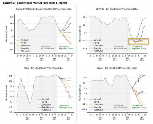关于未来CTA资金流向,高盛预测: 未来一周:若市场持平,全球将抛售390亿美元;若市场上涨,全球将抛售240亿美元;若市场下跌,全球将抛售530亿美元。 未来一个月:若市场持平,全球将抛售470亿美元;若市场上涨,全球将买入660亿美元;若市场下跌,全球将抛售1260亿美元。 值得注意的是,尽避全球其他市场可能仍有大量抛售压力(主要因为欧洲、日本等股市表现大幅优于美国),但在几乎所有情景下,CTA对美国股票的抛售已经结束。