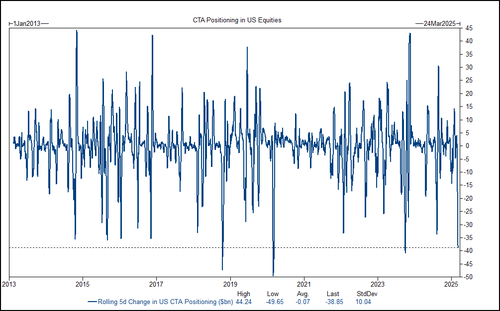 高盛表示,CTA在过去5个交易日内已售出390亿美元美股,目前对美股持有空头头寸约100亿美元,完全清空了截至2月中旬持有的约2000亿美元全球多头仓位。尽避全球其他市场可能仍有大量抛售压力,但在几乎所有情景下,CTA对美国股票的抛售已经结束。 在经历了堪比新冠疫情时期的剧烈抛售后,美股市场终于迎来转机。根据高盛最新分析,导致本轮市场大跌的主要技术性力量——CTA趋势追踪型量化基金的抛售潮已经结束,这为美股市场带来了短期企稳的可能性。 上周五,高盛曾观察到CTA社区的最新头寸,并指出抛售已接近尾声: “CTA上周在全球范围内已售出470亿美元股票。根狙桃们的计算,如果一周内市场平盘,还将抛售400亿美元;如果一个月内市场平盘,则将抛售430亿美元。这意味着按目前市场位置,这种技术性供应将在下周基本结束。” 两周前,当标普500指数接近历史高点时,市场已经出现了CTA开始清仓的预警信号,预计清仓规模高达1930亿美元。随后发生的事情令投资者目不暇接:美股经历了后疫情时代最为残酷的抛售之一,纳斯达克指数迅速跌入技术性调整区域,抹去了大选后的全部涨幅并进一步下跌。到上周一,市场还在担忧,流动性匮乏、对冲基金短期覆盖与CTA量化基金的大规模抛售交织作用,可能导致股市面临更大的下行风险。 然而,随着周一纳斯达克指数暴跌4%,并从历史高点回落13%,情况已有变化。高盛CTA策略师Cullen Morgan表示,CTA在过去5个交易日内已售出390亿美元美股,目前对美股持有空头头寸约100亿美元,完全清空了截至2月中旬持有的约2000亿美元全球多头仓位。
