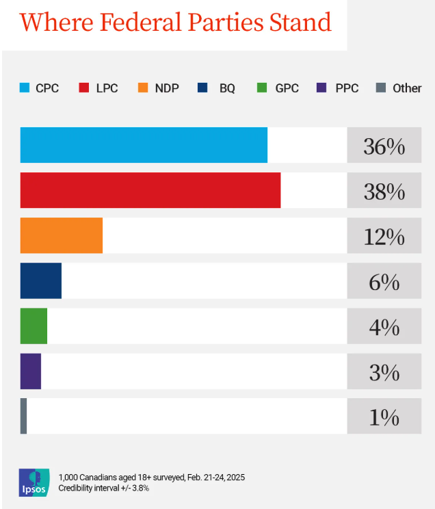 据悉,这份民调是由Ipsos公共事务部门进行,在2月21日至24日期间针对1000名加拿大选民进行了调研,数据误差范围为±3.8个百分点。 本月早些时候发布的上一次Ipsos民调中,保守党支持率为41%,而自由党仅28%。 未曾想短短几周之间,自由党的支持率猛增10%,保守党则下跌5%,连带新民主党(NDP)和魁人政团(Bloc Québécois)也出现支持率下滑(分别降至12%和6%)。 Ipsos CEO达雷尔·布里克(Darrell Bricker)指出,这一变化主要受到两个因素影响: 首先是自由党正在更换领导层,特鲁多已经宣布辞职,自由党正在进行新党魁竞选,这让选民重新关注自由党。 其次是川普的关税威胁,加拿大正面临美国前所未有的关税冲击,民众更关注如何应对经济危机,而不是过去10年自由党的执政问题,“加拿大人现在更关注的是‘如何应对美国’,而不是‘自由党过去10年做了什么’。”