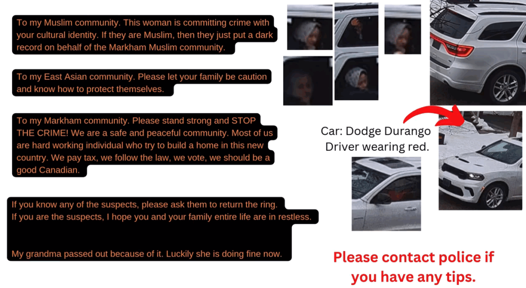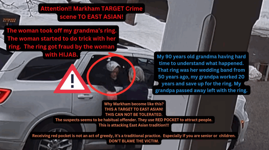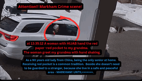 老太太经历此事伤心欲绝一度昏倒,所幸目前身体已无大碍。 她的家人表示:“作为一名来自中国的90岁高龄老人,收红包对她来说并非贪婪的行为,而是一种传统习俗。她从未想过自己需要对陌生人有所防备,因为她一直生活在一个安全祥和的万锦社区。” 老人的家人在社媒上公布了骗子车型并发布了致社区的信息: 致万锦社区:万锦一直是一个安全、和平的社区,我们大多数人都努力工作、遵纪守法、缴税投票,努力在加拿大建立自己的新家园。我们不能容忍这样的欺诈行为,请大家团结一致,站出来制止犯罪! 致穆斯林社区:这名女子正在利用你们的身份犯罪,这不仅是对受害者的伤害,也让整个万锦穆斯林社区的形象受损。