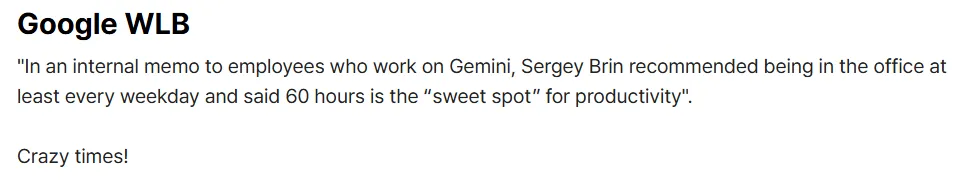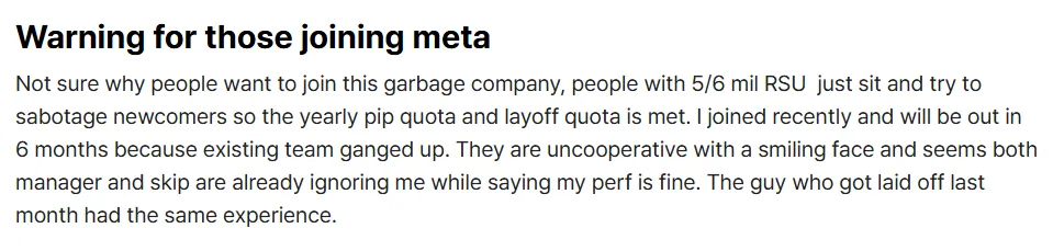 | 近日,Meta CTO Andrew Bosworth语出惊人,在采访中被问道如何看待公司WLB越来越差时,称:超长工作时间对员工来说是一个礼物。 这段发言和“能够996是员工修来的福报”如出一辙,有网友调侃道:上一个这么口出狂言的企业家的公司的“福报”已经到了;有网友看热闹不嫌事大:北美大厂打工人的福报也来了! 此外,谷歌创始人谢尔盖.布林近日在给Gemini团队员工的邮件中表示:建议大家实行5天RTO,每周工作60小时是提高生产力的“最佳时间”。 “潮水退去才知道谁在裸泳”的风终究吹到了北美Tech。科技公司放弃囤积人才,疯狂扩招的竞争策略后,曾经被视为大厂制胜法宝的硅谷码农失去光环,彻底成为科技公司眼中的待割的韭菜。 2025,Meta不断作妖,Meta员工叫苦连连。不仅是扎克伯格三番两次公开敲打Meta员工尤其是程序员,连Meta CTO也接连口出狂言,让不愿接受末位淘汰制的员工自行滚蛋,强行美化“996”。 据此,Meta程序员担忧道:CTO这样表态,不会是公司接下来想重点整治码农吧? 扎克伯格跳来跳去就算了,CTO也出来搅浑水是什么个意思,是Meta的工程师还不够努力吗? 不理解,一个CTO不好好钻研技术,整天发表一些鞭策员工的言论,他搁这给小扎挡刀呢? 近期,由于Meta骚操作实在太多,Meta吐槽贴铺天盖地,强势顶替谷歌和亚麻,成为北美Tech的话题王。继裁员、末位淘汰、削减老员工股权后,Meta给新员工降职降薪再次引发热议。 很多正在找工作的码农反馈,Meta今年的包裹比去年小了很多,不仅停止了E4的招聘,还拿着E4的钱招E5。此外,Meta还频繁给面试过的码农自动降级,有E7面试者被降为E6,E6面试者降为E5。 此外,新员工反馈,Meta现在对新人非常不友好,大部分老员工甚至领导都在想方设法的不让员工度过试用期。 刚在Meta工作了两个月的Alan吐槽道:每个人都在说我没有什么问题,当我遇到问题时他们也不会给我提供帮助,真的受不了这种冷暴力了! 总之,现在的Meta对老员工很毒,对新员工更毫不客气,无差别剥削每一个人,Meta的新人保护期彻底失效。在今年的北美科技公司WLB红黑榜中,Meta位列第11位,超越亚麻,稳居FAANG之首。 据此,大家纷纷表示:现在进Meta的性价比太低了!更有Meta员工直接劝退道:现在千万别来Meta,尤其是E5。 谷歌带头开卷!北美Tech养老时代覆灭 如今的北美Tech公司,不仅Meta,亚麻这类传统卷厂卷上加卷,连谷歌,微软等传统养老厂也步入了“996”时代。 近期有码农求问:是否要放弃高薪跳槽至WLB比较好的微软?大部分北美er表示千万不要对花生厂的WLB再抱有期待,这家公司早已经不是当年那个性价比高,时薪高的养老厂了! 谷歌更是早在去年就开启了鞭策员工行动,一边明里暗里的指责谷歌员工太躺平,一边加大员工的工作强度。近日,谷歌创始人谢尔盖.布林直接在给Gemini团队员工的邮件中表示:建议大家实行5天RTO,每周工作60小时。 此言论一出,北美打工人纷纷吐槽称:我们为企业家做牛马,企业家拿我们当傻子。 @Jack 我认为不眠不休绝对比每周工作60小时更能提高生产力,他们怎么不要求我们这么做?无语死了。 @Kai 员工每周工作40小时都满足不了这些邪恶企业家了,一群贪得无厌,没有下限的家伙。太可恶了! @Axel 我笑了,我还说给每个员工每年多发10万刀是提高生产力的最佳方式呢,怎么没有人这么干。 为了让员工多干活少要钱,北美Tech雇主们无所不用其极,发表各种逆天言论,全然抛弃体面。此情此景下,硅谷码农也只能高歌一曲,“躺平生活一去无影踪,养老时代小鸟一样不回来”。 |