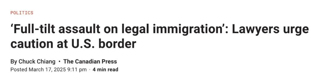 另外,3月17日,加媒报道称,移民律师表示,一名温哥华女子因签证被拒而在美国被拘留的案件,向加拿大人发出了警告——如今跨境赴美工作已不再是“常规操作”。