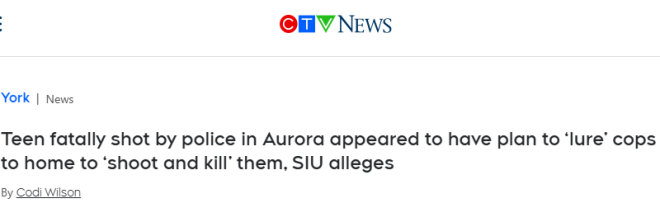 去年10月,大多伦多Aurora市的一名青少年被警察枪杀。特别调查组SIU近日公布了案情细节。证据显示,这名青少年显然报告了一起假的入室盗窃事件,试图“引诱”警察到他家并“开枪打死”他们。