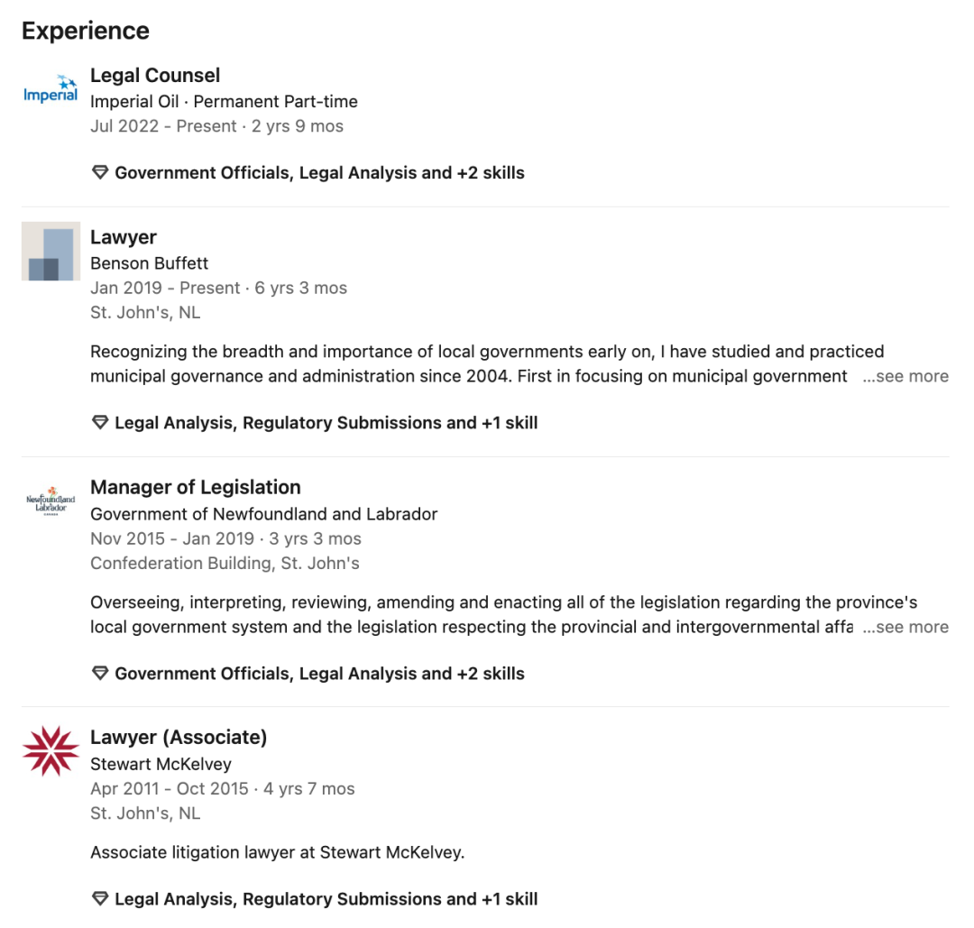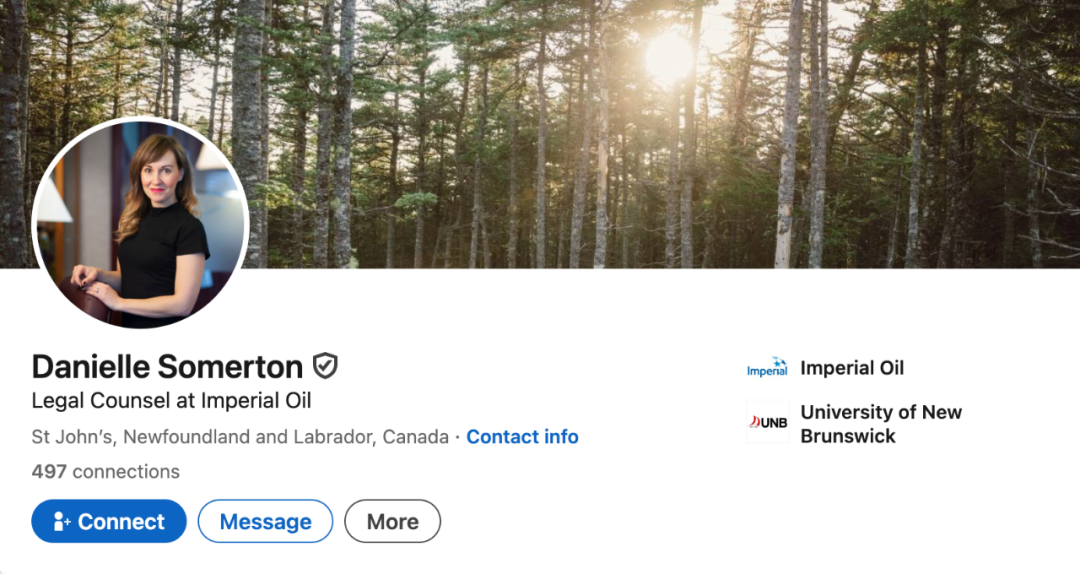 小编从领英上找到了这名女子的资料,显示该女子居住在纽芬兰,现在是帝国石油有限公司(Imperial Oil)的律师。2015年至2019年期间曾任纽芬兰和拉布拉多政府的法律事务经理。