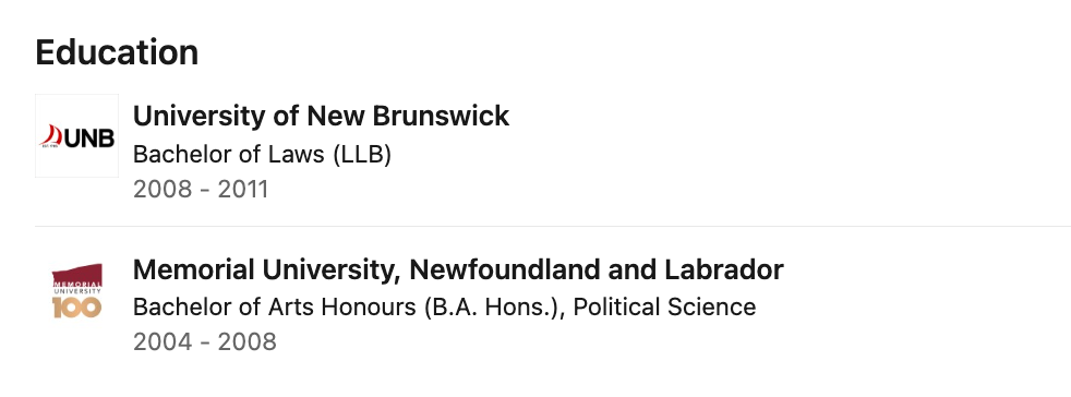 2004年至2008年在纽芬兰和拉布拉多纪念大学获政治学荣誉文学学士学位,之后2008年到2011年在新不伦瑞克大学获法学学士学位。从毕业的时间推断,这名女子年龄大概40多岁。