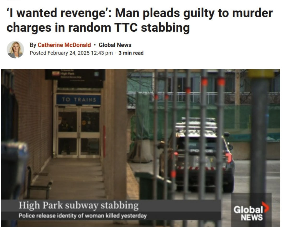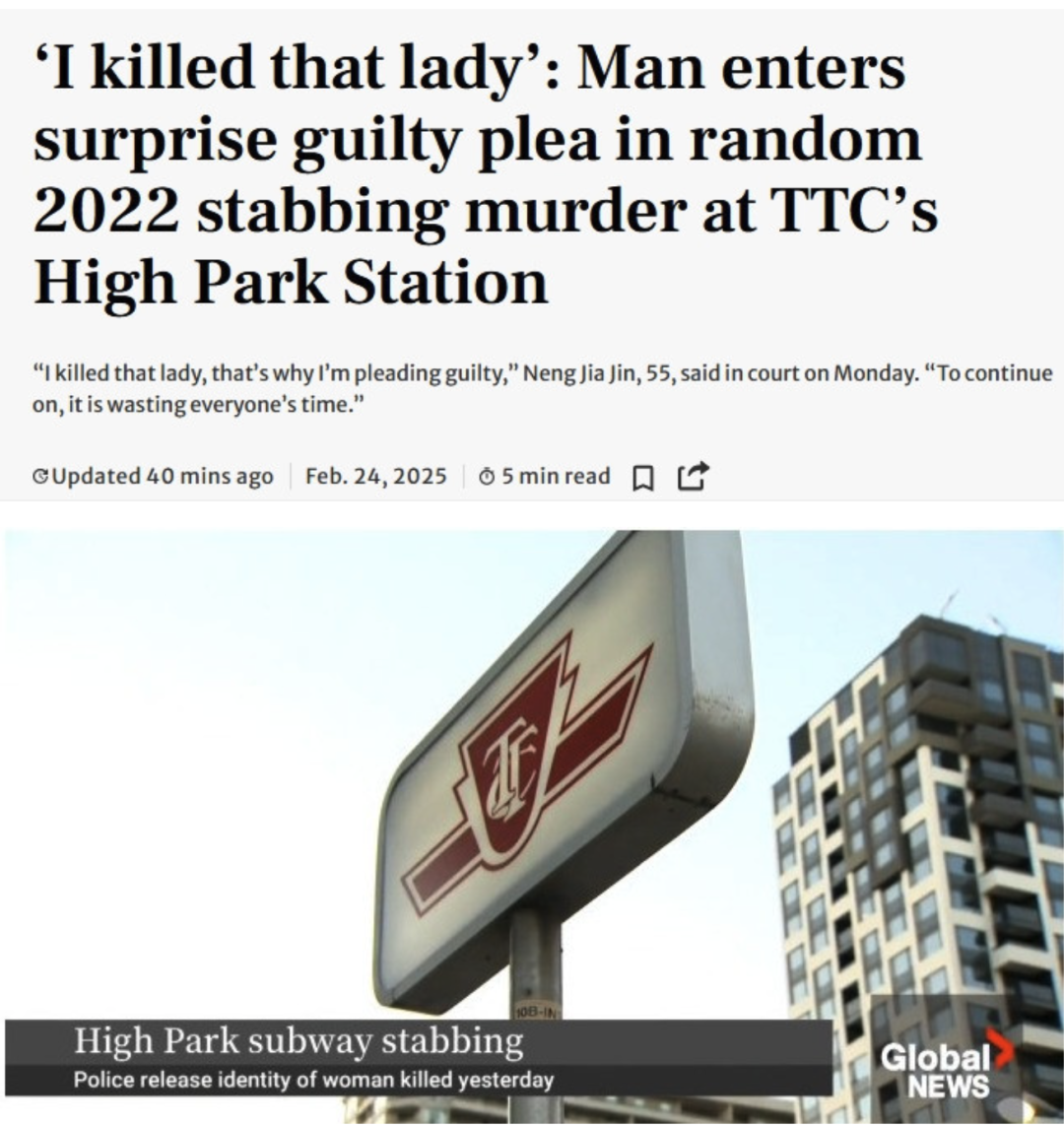 华裔男子金某(Neng Jia Jin)近日在法庭上出人意料地认罪。 他被控一级谋杀,涉及2022年多伦多TTC High Park地铁站的随机持刀袭击案。 当时他刺死31岁女子Vanessa Kurpiewska,并刺伤另一名女子。