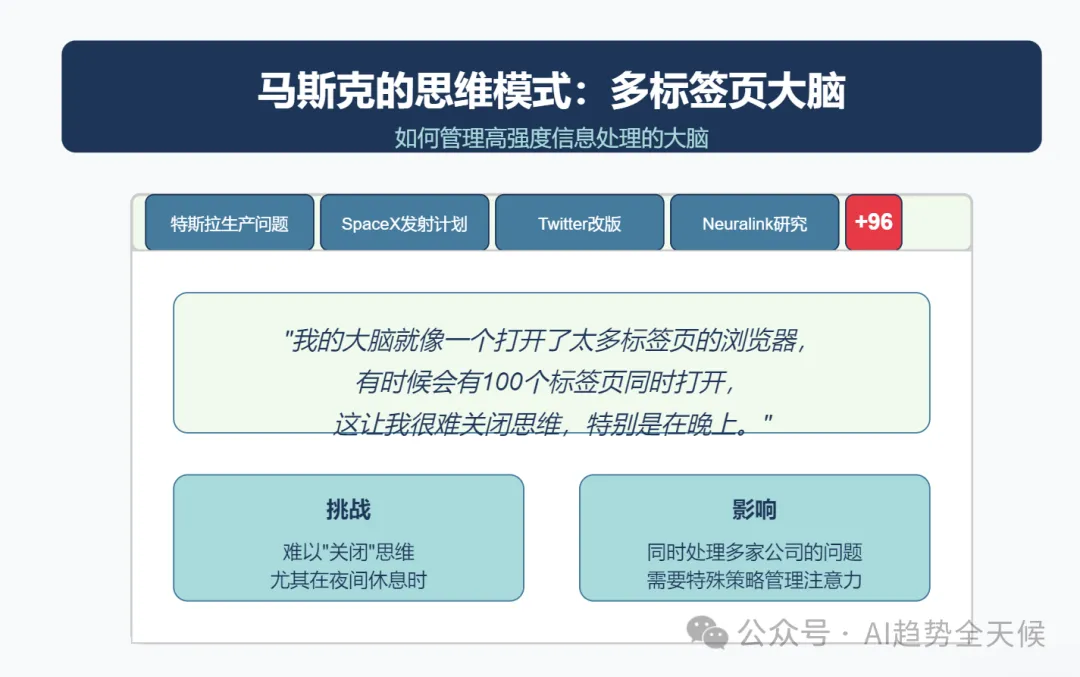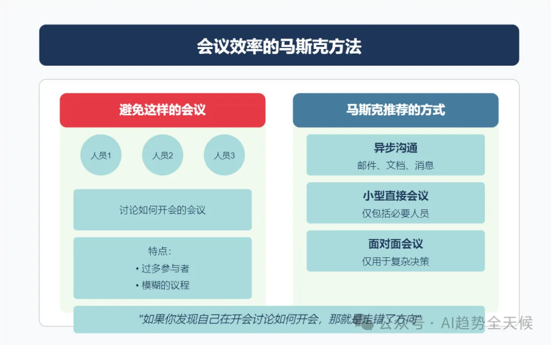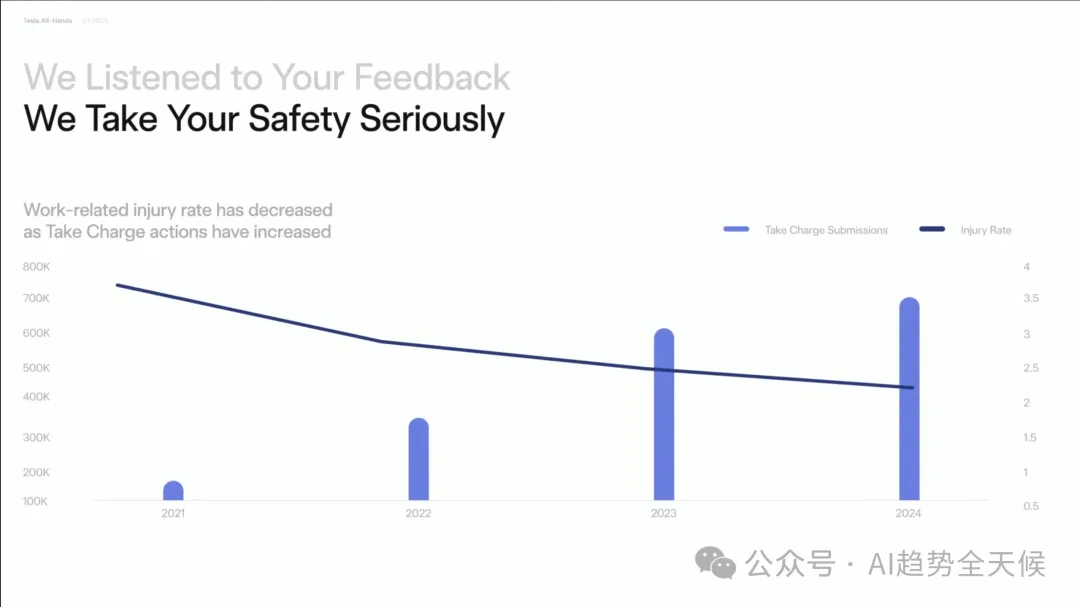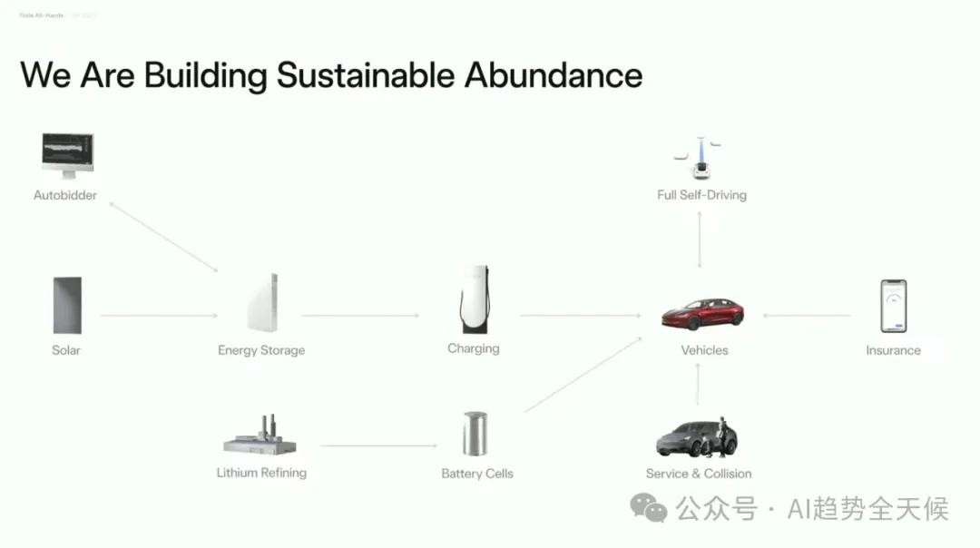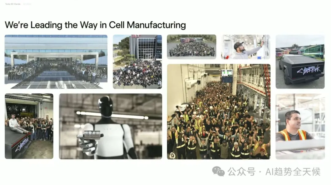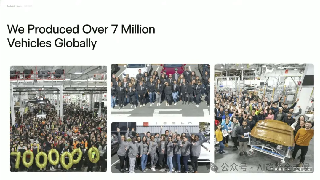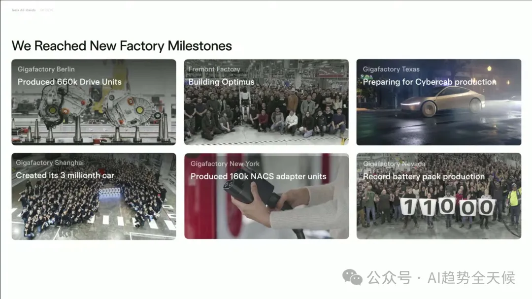 “ 马斯克在全员大会首次明确阐述了特斯拉使命的升级:从"加速世界向可持续能源的转变"扩展为"为全人类创造可持续繁荣(sustainable abundance)" ” ? 核心要点速览 -可持续丰富愿景:马斯克提出特斯拉使命升级,从"可持续能源"到"可持续丰富",通过AI、机器人和可再生能源创造人人享有一切的未来 -Optimus机器人战略:预计2025年将成为"史上最大产品",今年生产5000台,明年50000台,2025年下半年面向消费者市场 -自动驾驶价值倍增:FSD将使1000万特斯拉车队的使用价值提升5-10倍,创造前所未有的软件价值增长 -制造革命:Cybercab生产线将实现5秒一辆车的极速生产,颠覆传统汽车制造流程 文末有马斯克在大会上跟员工分享的他应对繁忙思维的个人方法,以及帮助他在信息过载时代的管理注意力的技巧。 特斯拉已从初创期的年产20辆汽车,发展到累计生产超700万辆,预计2025年将突破1000万辆里程碑。Model Y连续两年成为全球最畅销汽车,Cybertruck上市即成为最畅销电动皮卡,安全性获五星评级(防弹设计+碰撞安全)。 Tesla All-Hands, March 20, 2025 ? 洞察 特斯拉已从单纯的电动车制造商,转型为集能源、AI和机器人于一体的综合科技公司,其产品矩阵覆盖从个人交通到能源基础设施的完整生态系统。 为什么从"可持续能源"到"可持续繁荣"? 马斯克在会议中首次明确阐述了特斯拉使命的升级:从"加速世界向可持续能源的转变"扩展为"为全人类创造可持续繁荣 (Sustainable Abundance for All)"。 "想象一个未来,你可以随心所欲地拥有任何商品或服务,而且这一切都是在保护自然环境的前提下实现的。这听起来像是乌托邦,但我要告诉大家的是,通过我们正在开发的技术,这个未来确实可以实现。。" Tesla All-Hands, March 20, 2025 -自动驾驶汽车 -Optimus人形机器人 -可持续能源(太阳能+电池) -AI计算 马斯克正将特斯拉定位为解决人类根本需求的公司,不仅是交通和能源问题,而是创造一个资源无限、人人富足的未来社会形态。这一愿景将特斯拉与其他汽车制造商彻底区分开来。 Optimus:特斯拉的下一个万亿美元产品 马斯克对Optimus人形机器人给予了前所未有的高度评价,称其将成为"有史以来最大的产品,没有之一",规模将是第二大产品的10倍。 Tesla All-Hands, March 20, 2025 生产规划: -2024年:5,000-10,000台("一个罗马军团") -2025年:约50,000台("10个军团") -长期:每年数千万至上亿台 -2025年中期至下半年:开始向特斯拉员工提供 -之后逐步向消费者市场开放 -真实世界AI技术(从自动驾驶技术转化) -电机、电池和电力电子学专业知识 -结构设计能力 -规模化制造能力 特斯拉在Optimus上的布局显示,马斯克认为通用人形机器人将成为下一个计算平台,可能超越智能手机和个人电脑的经济影响。特斯拉独特的垂直整合模式(AI+硬件+制造)在这一领域可能构建难以逾越的竞争壁垒。 自动驾驶:软件创造的前所未有的价值倍增 "这是一个深刻的变革,前所未有...从未有过一个软件更新能将巨大资产基础的价值提升500%到1000%。" Tesla All-Hands, March 20, 2025 -自动驾驶汽车将在全球普及 -特斯拉将在各大洲获得监管批准 -特斯拉将主导自动驾驶市场 马斯克描述的是一种"软件魔法":通过OTA更新,瞬间将已售出的1000万辆特斯拉转变为可自主运营的机器人出租车,创造前所未有的资产价值倍增。这种商业模式创新可能比技术创新本身更具颠覆性。 能源业务:从家庭到电网的全面布局 Powerwall 3: -经过三代迭代,终于达到"伟大产品"标准 -提供家庭能源保险,确保停电时不间断供电 -与太阳能结合可实现完全脱网 Tesla All-Hands, March 20, 2025 -可将现有电网输出能力提高一倍以上 -优化电网稳定性,吸收电力峰值并填补低谷 -与风能和太阳能完美匹配 Tesla All-Hands, March 20, 2025 功率提升至500kW,支持Semi卡车1.2MW超快充。 Tesla All-Hands, March 20, 2025 特斯拉正在构建从发电、储能到消费的完整能源生态系统,这使其能够提供传统能源公司无法企及的端到端解决方案。马斯克对太阳能+电池的长期押注,表明他认为这是能源领域的终局解决方案。 Tesla All-Hands, March 20, 2025 AI计算:从Cortex到Dojo的自研之路 Tesla All-Hands, March 20, 2025 -拥有50,000个GPU,即将扩展到100,000个 -利用车队数据训练自动驾驶AI -将成为全球前五的AI训练中心 Dojo超级计算机: -Dojo 1已在纽约超级工厂和帕洛阿尔托投入使用 -目前承担约5-10%的自动驾驶AI训练负载 -Dojo 2正在开发中,性能将是Dojo 1的10倍 Tesla All-Hands, March 20, 2025 -所有特斯拉车辆现已配备AI4硬件 -高性能、低功耗的AI推理计算机 -市场上仍无可比拟的替代品 特斯拉正在AI芯片和计算基础设施领域建立垂直整合优势,这可能成为其在自动驾驶和机器人领域的关键差异化因素。自研AI芯片战略使特斯拉减少了对英伟达等供应商的依赖,并可根据自身应用场景优化性能。 制造创新:Cybercab的革命性生产线 "Cybercab不仅是革命性的汽车设计,还是革命性的制造工艺...生产线看起来不像普通汽车制造线,而像一条超高速消费电子生产线。" Tesla All-Hands, March 20, 2025 -生产速度快到"人们甚至无法靠近" -最终目标是"5秒生产一辆车" -需要更大的铸造机和更快的金属冷却技术 -可能采用类似玩具车批量铸造的放大版技术 -新工厂布局:上海超级工厂启动Megapack生产,德州工厂筹备Cybertruck量产。 -电池技术: 自研电芯成本全球最低,布局全产业链(正极材料、锂精炼等)。 
