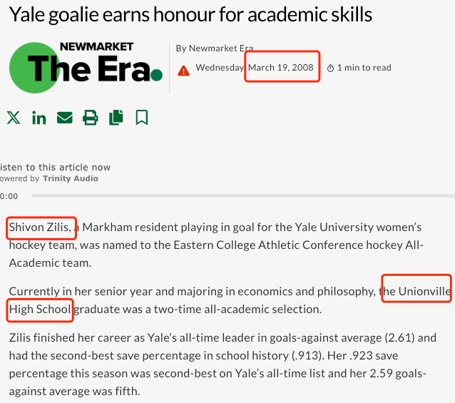齐利斯的职业生涯以耶鲁大学历史场均失球数 (2.61) 最高,并拥有学校历史上第二好的扑救率 (.913)。本赛季她的扑救率为 .923,在耶鲁历史榜单上排名第二,场均失球数 2.59 位列第五。除了在 Neuralink 担任运营和特别项目总监之外,齐利斯还是多伦多大学 Creative Destruction Lab 研究员,并担任 Vector Institute(人工智能研究所) 和 Alberta Machine Intelligence Institute(阿尔伯塔机器智能研究所) 董事会成员。